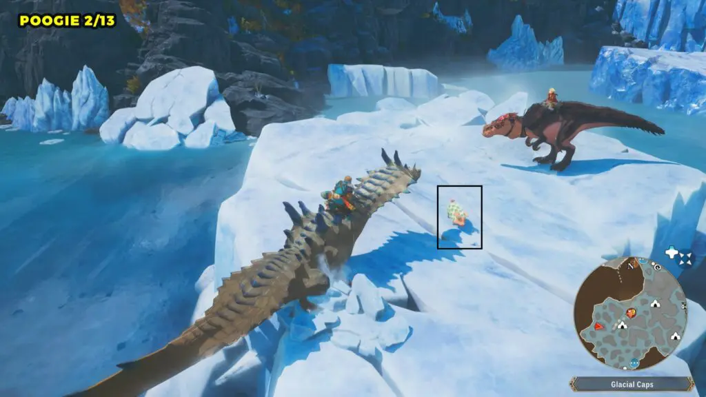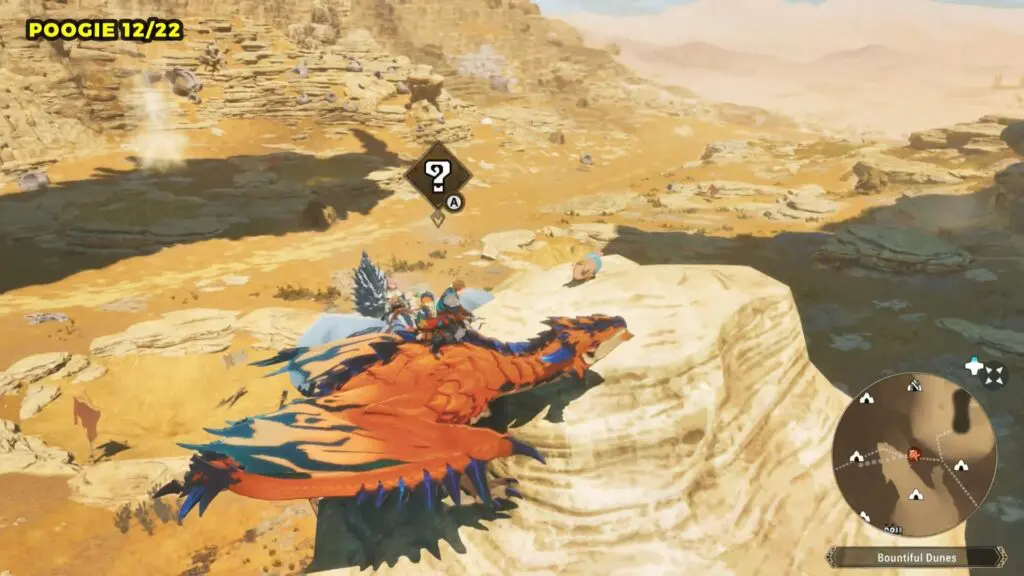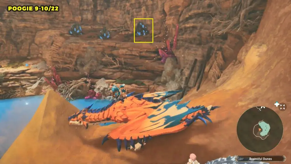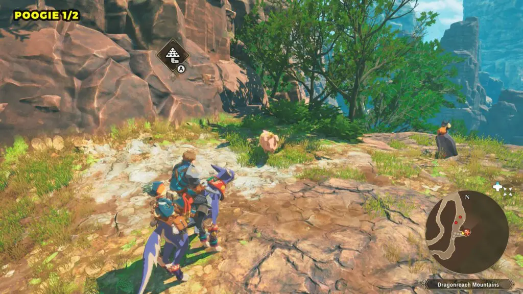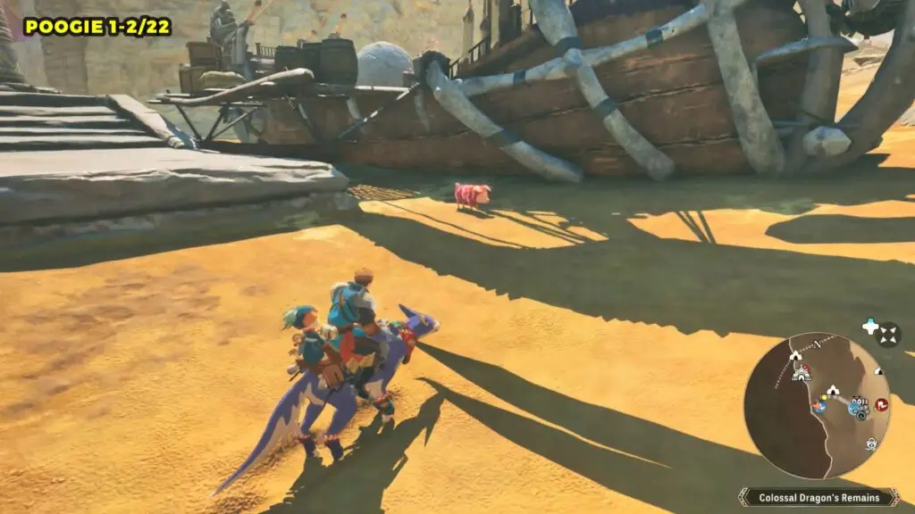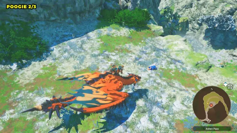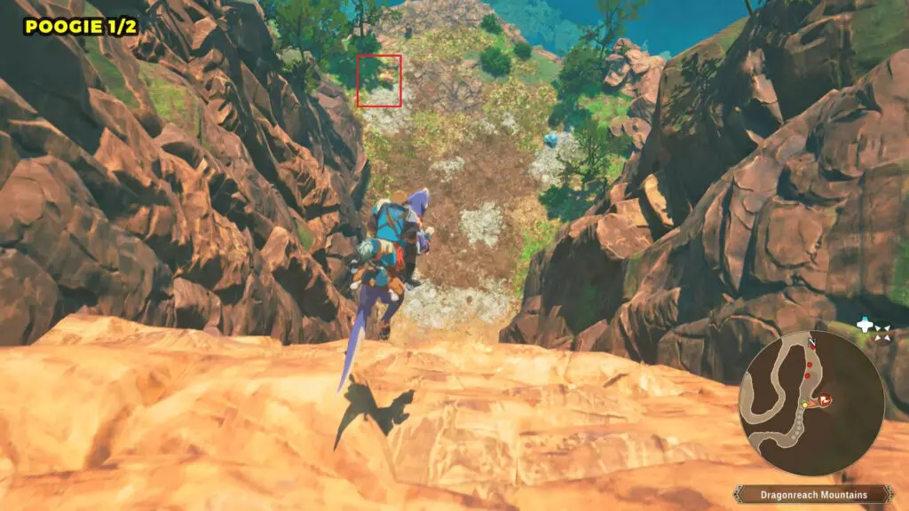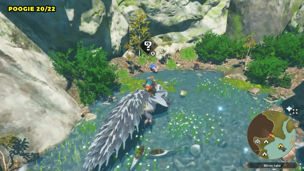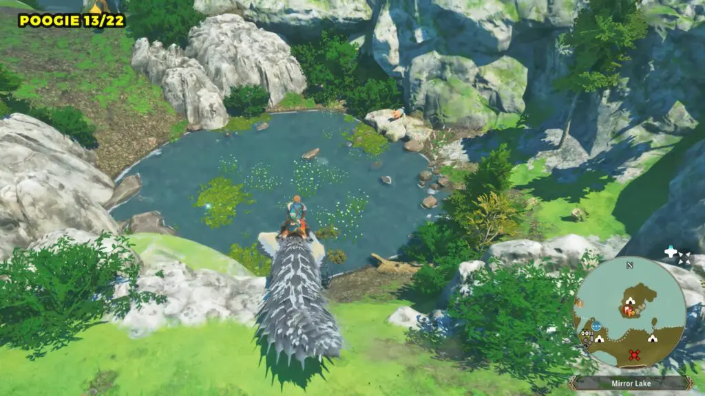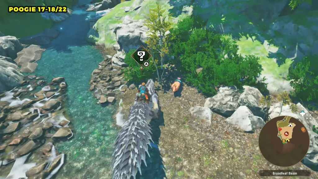 This Poogie is located on a cliff north of the lake, but it won’t appear right away. Head to the northern cliffside and use a Monstie with Ground Dive to uncover it. Once you use the ability, the Poogie will be revealed nearby.