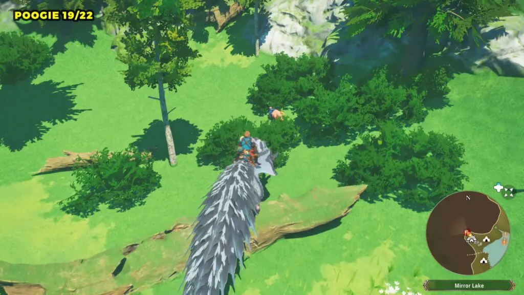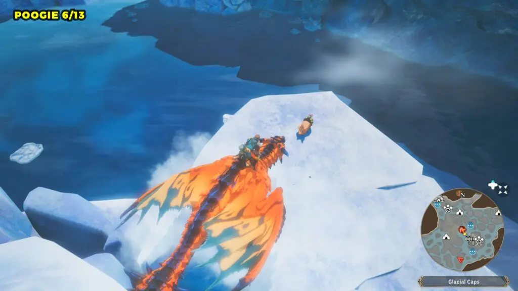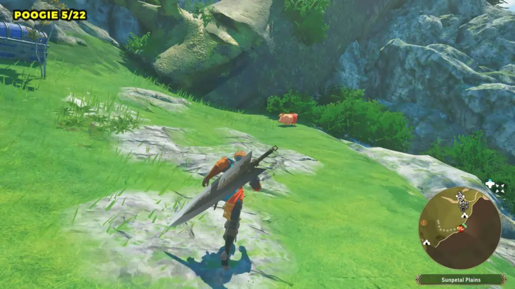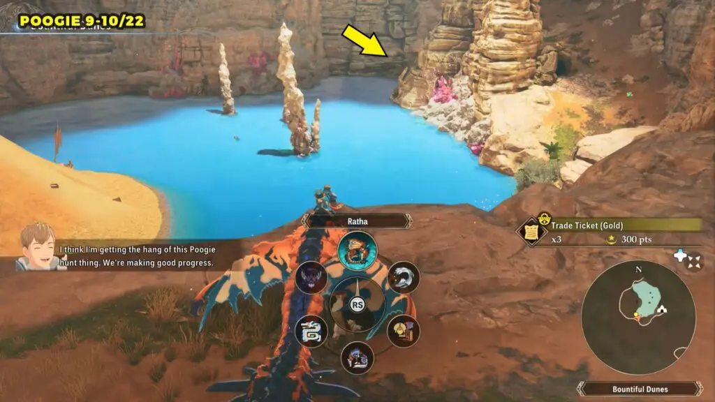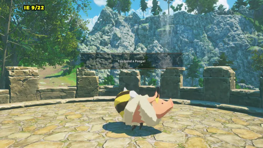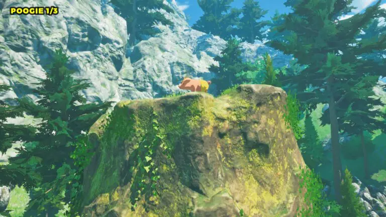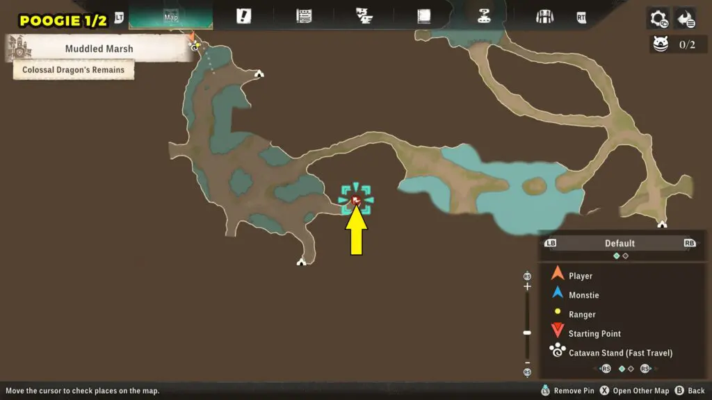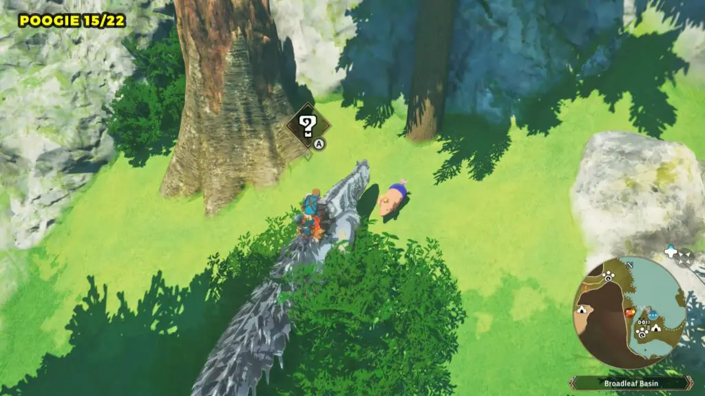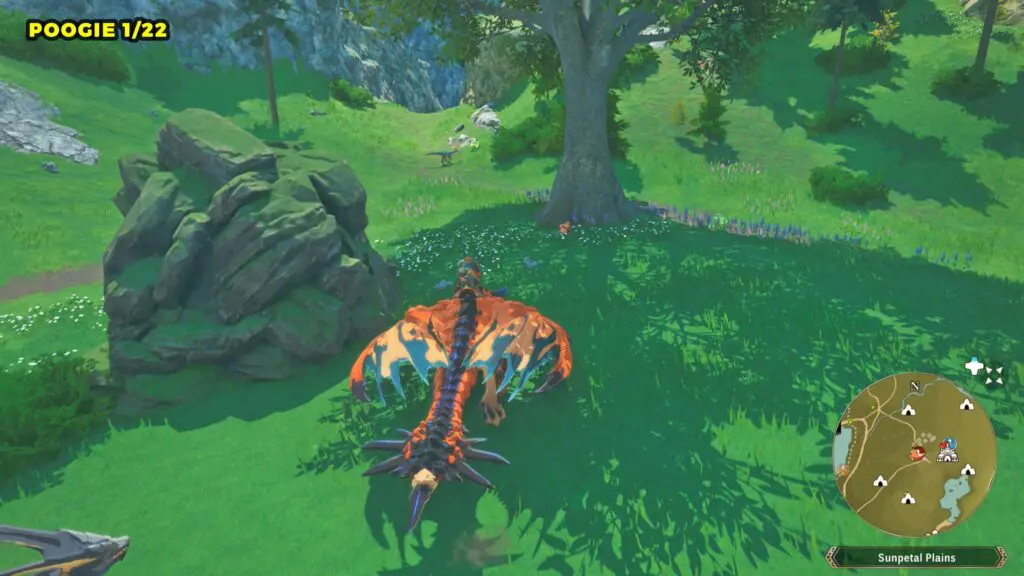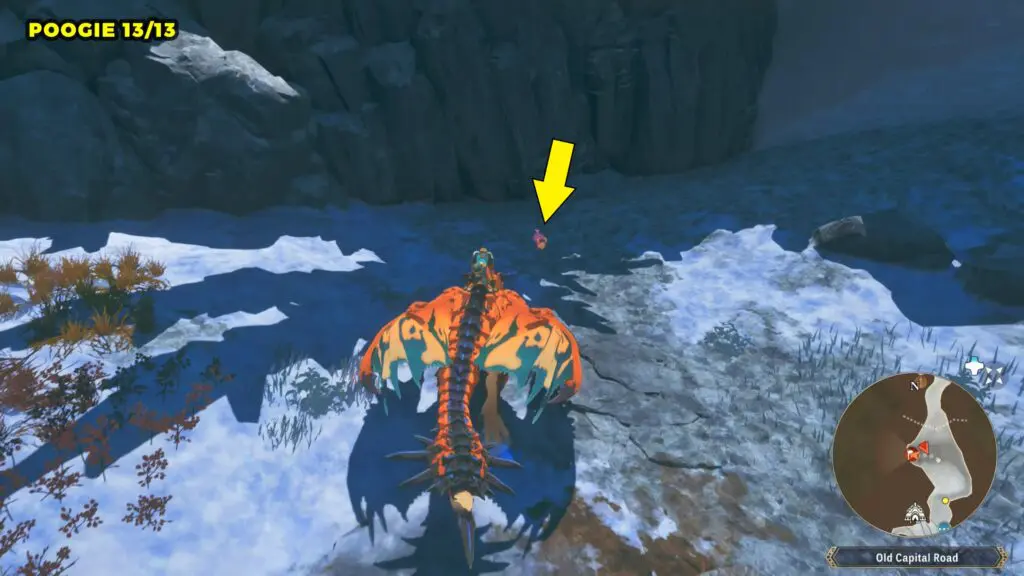 This Poogie is located on a cliff north of the lake, but it won’t appear right away. Head to the northern cliffside and use a Monstie with Ground Dive to uncover it. Once you use the ability, the Poogie will be revealed nearby.