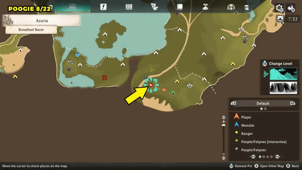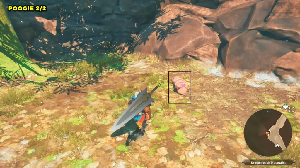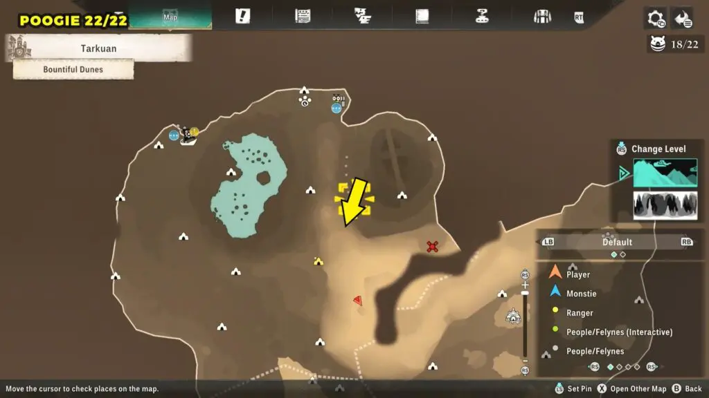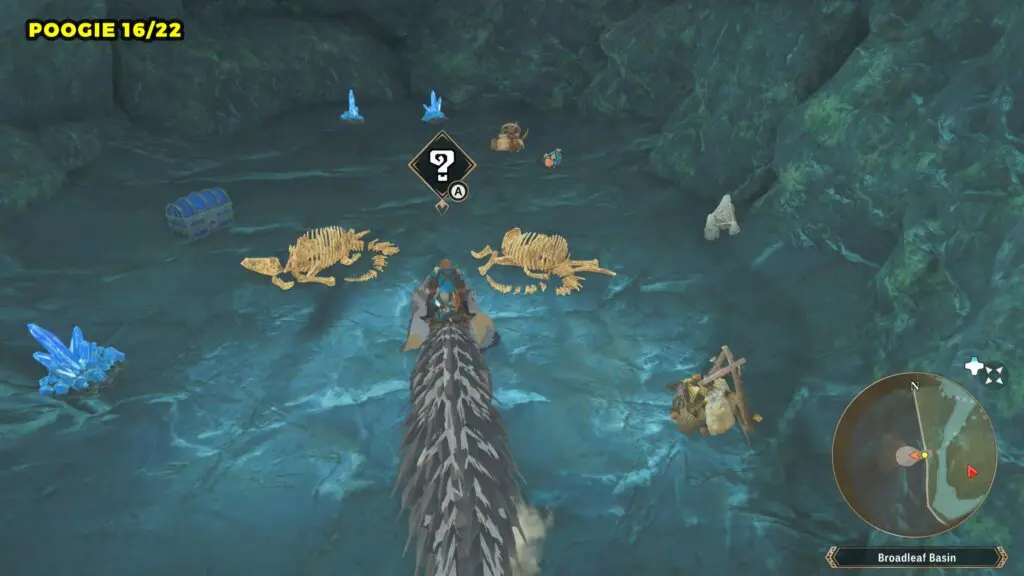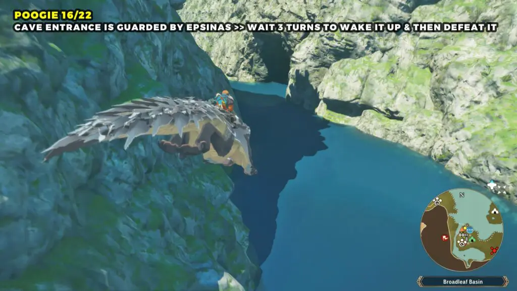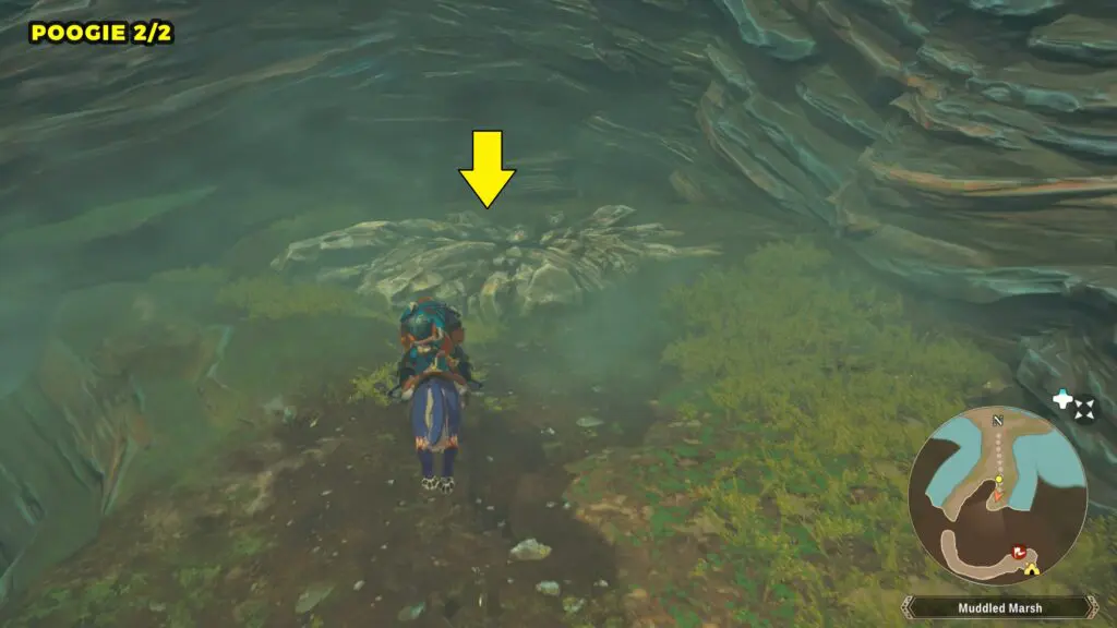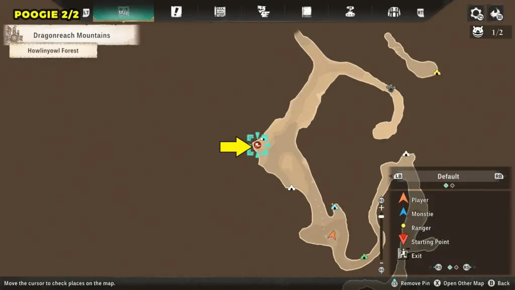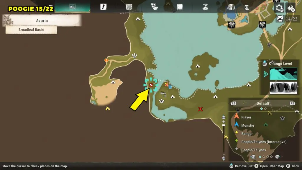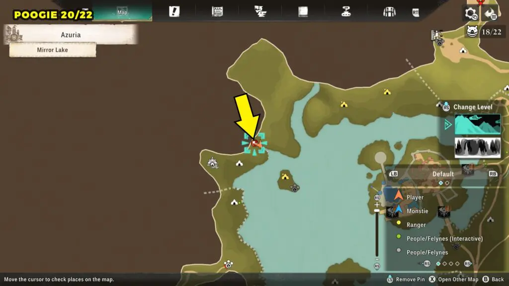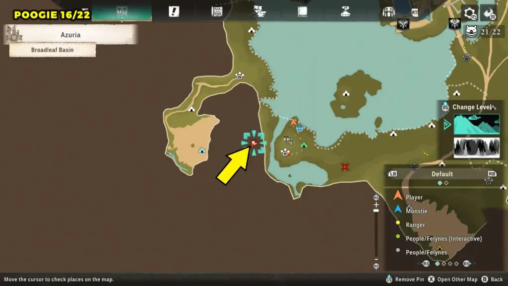 This Poogie is located on a cliff north of the lake, but it won’t appear right away. Head to the northern cliffside and use a Monstie with Ground Dive to uncover it. Once you use the ability, the Poogie will be revealed nearby.