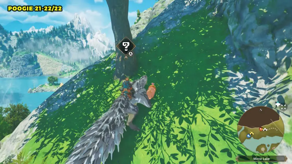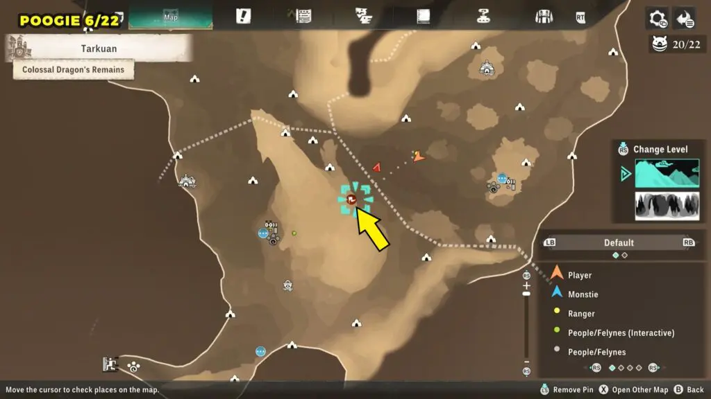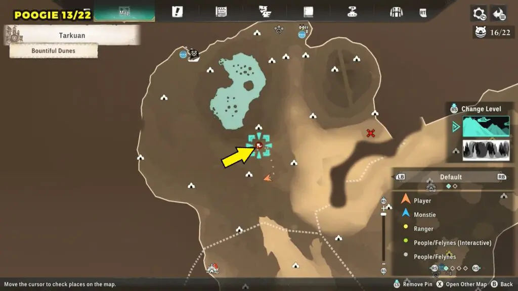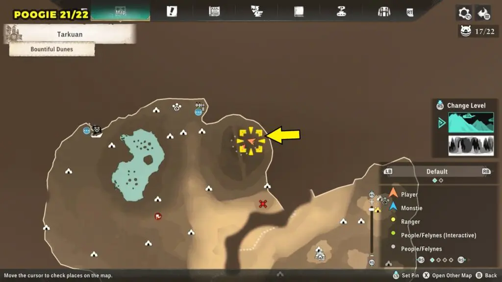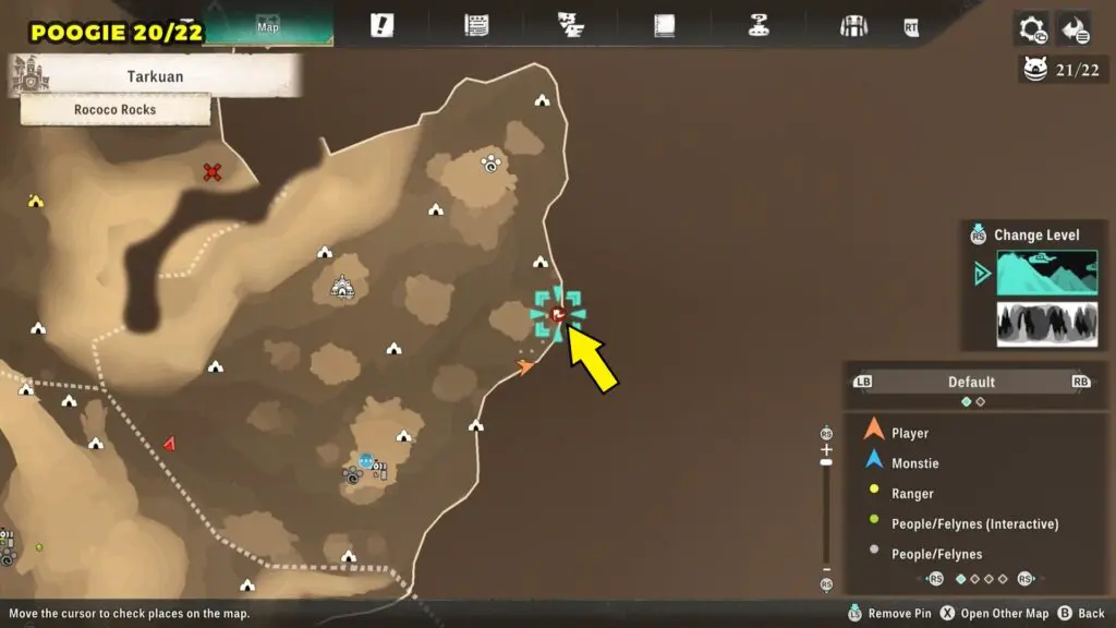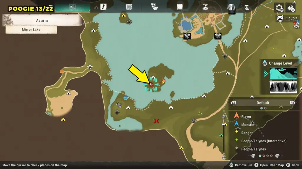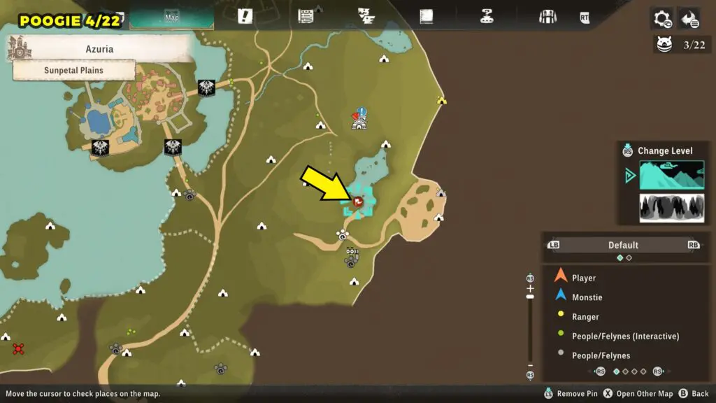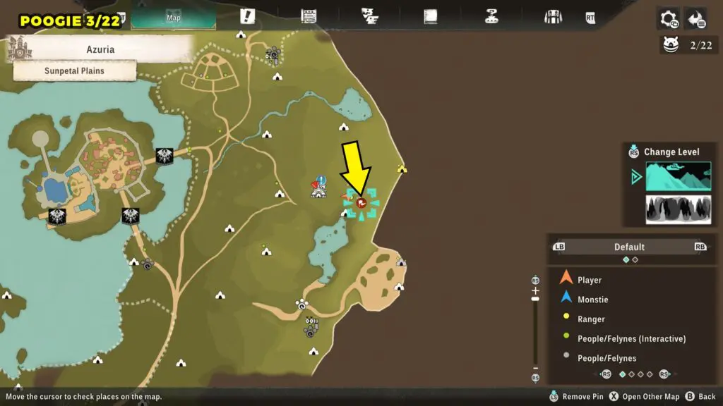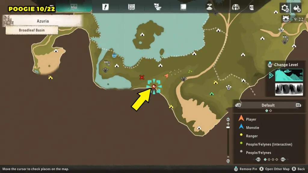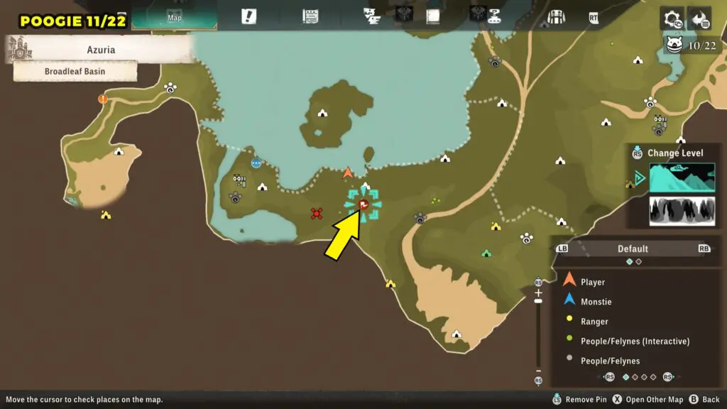This Poogie is located on a cliff north of the lake, but it won’t appear right away. Head to the northern cliffside and use a Monstie with Ground Dive to uncover it. Once you use the ability, the Poogie will be revealed nearby.