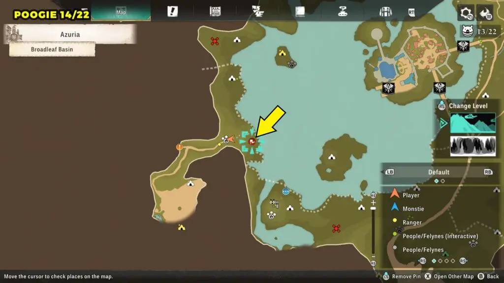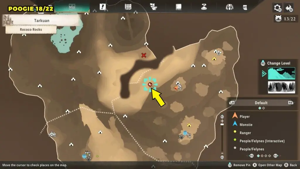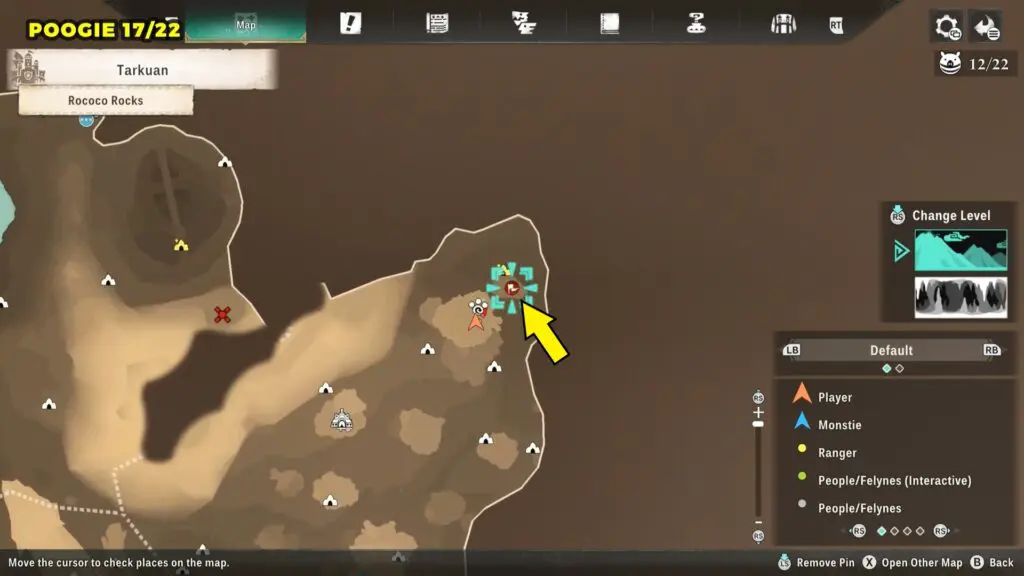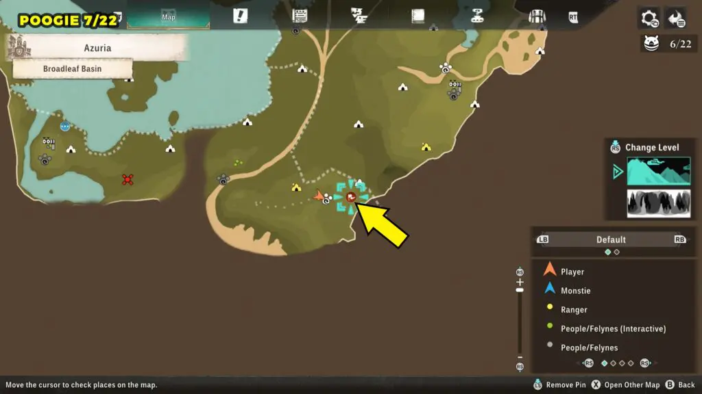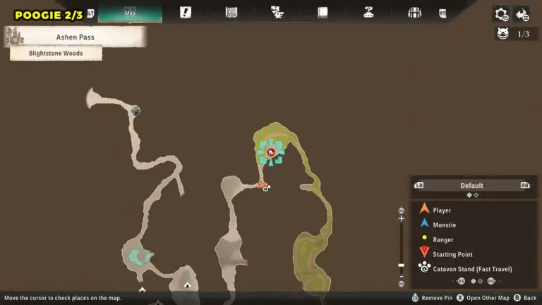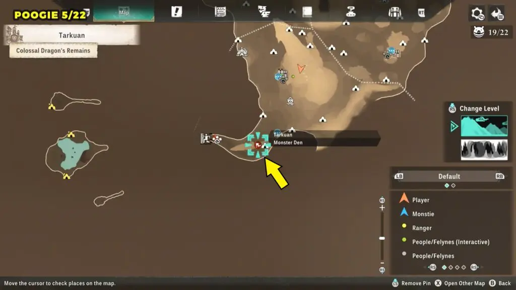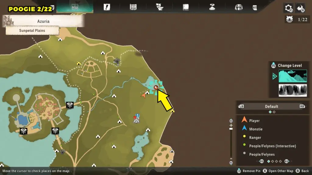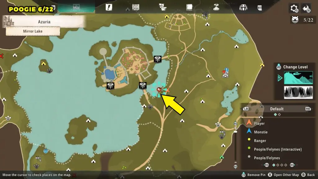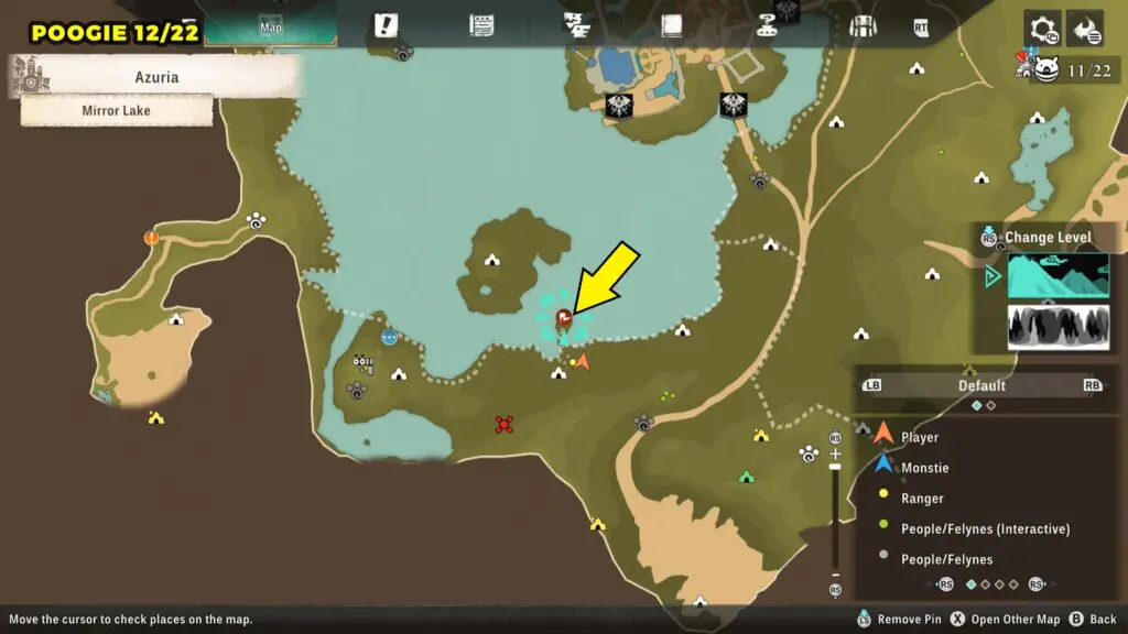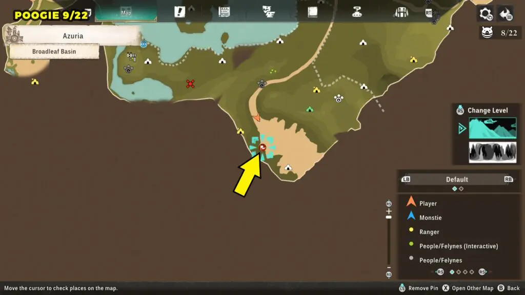 This Poogie is located on a cliff north of the lake, but it won’t appear right away. Head to the northern cliffside and use a Monstie with Ground Dive to uncover it. Once you use the ability, the Poogie will be revealed nearby.