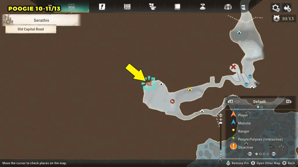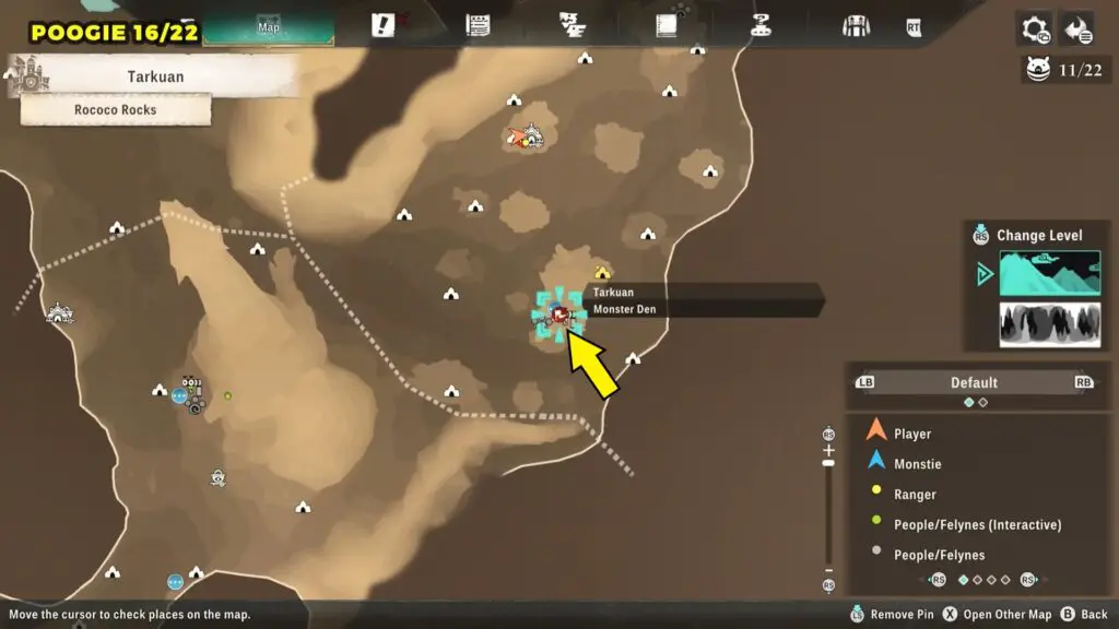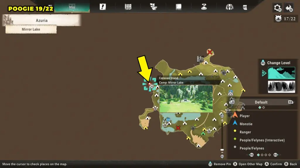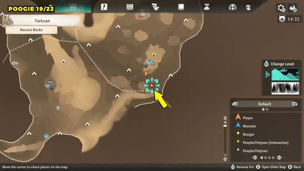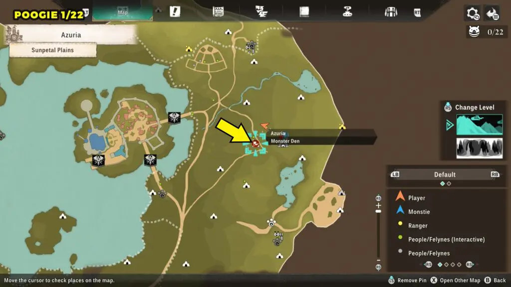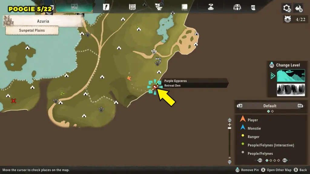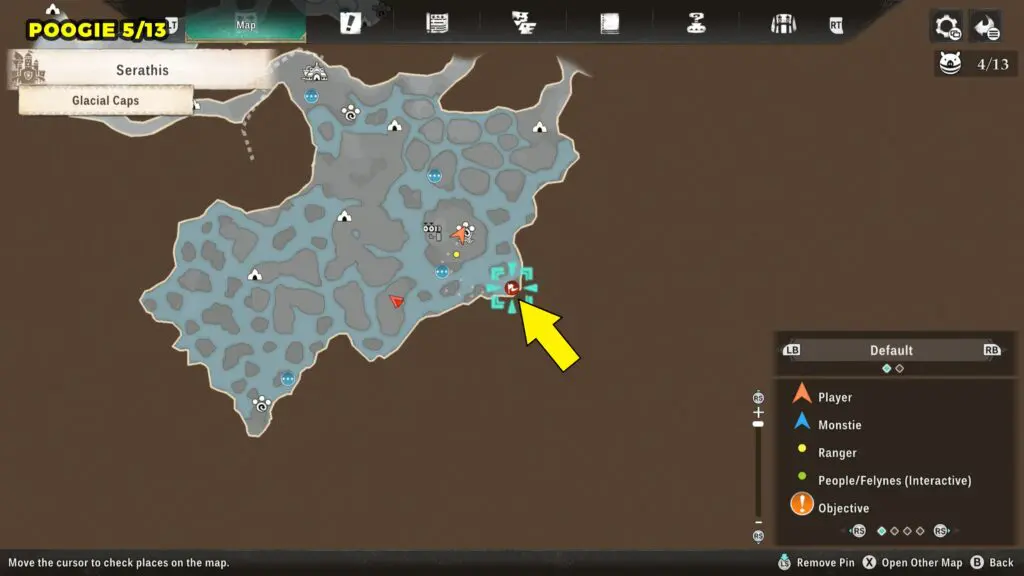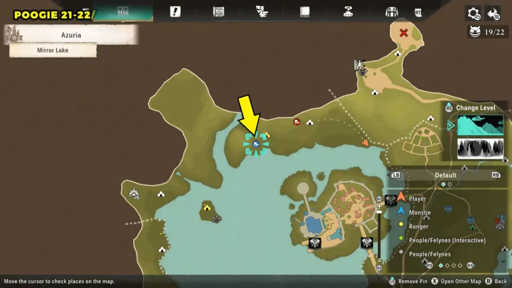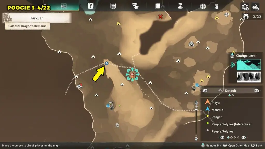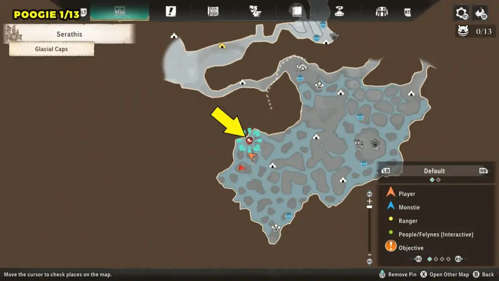 This Poogie is located on a cliff north of the lake, but it won’t appear right away. Head to the northern cliffside and use a Monstie with Ground Dive to uncover it. Once you use the ability, the Poogie will be revealed nearby.