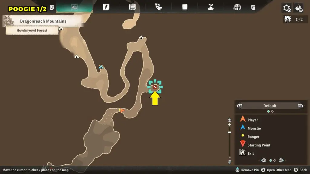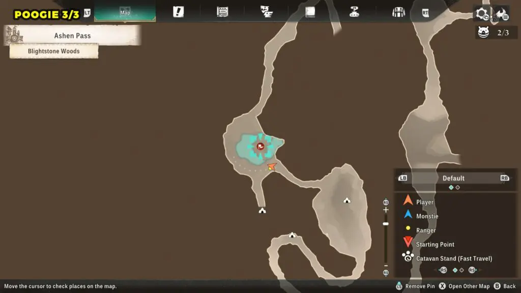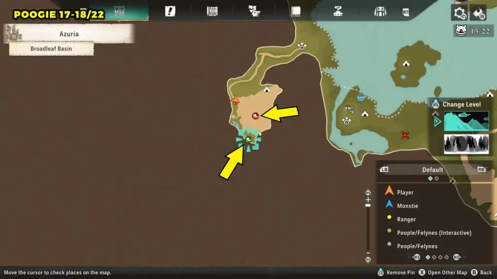 For the first location, head to the marked spot on the map, then drop down to the lower ledge on the right side of the path to find the Poogie.