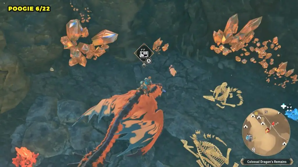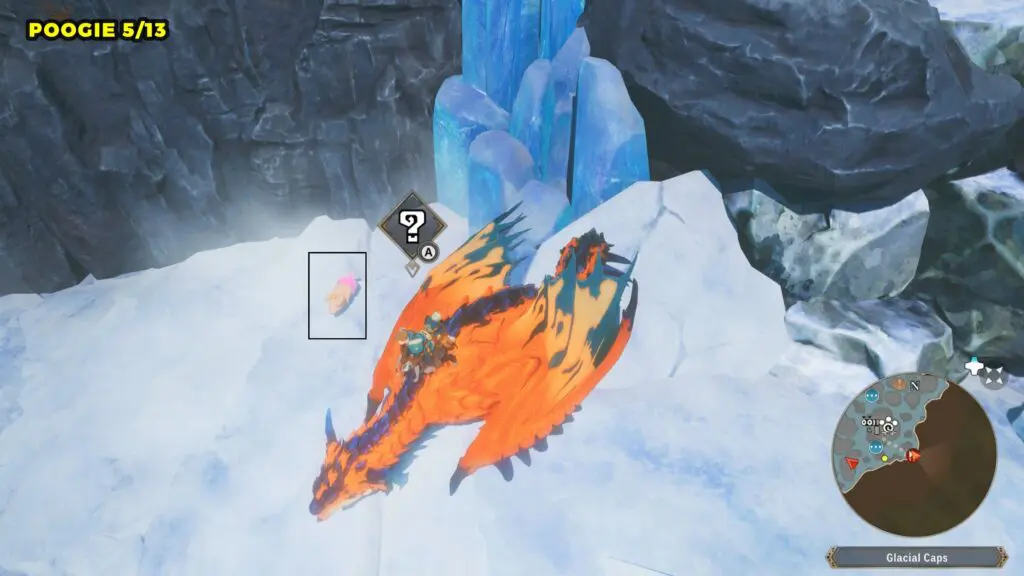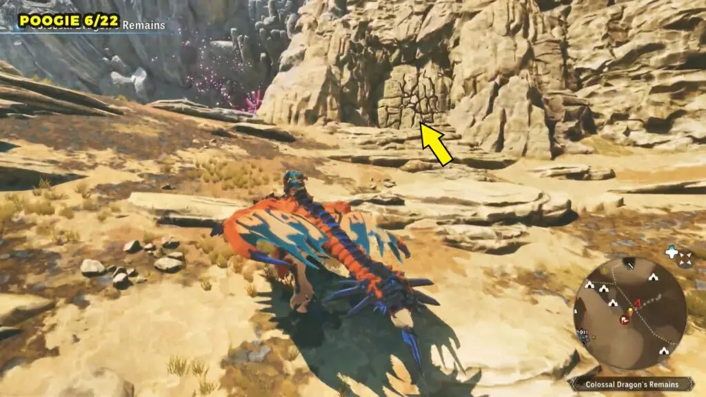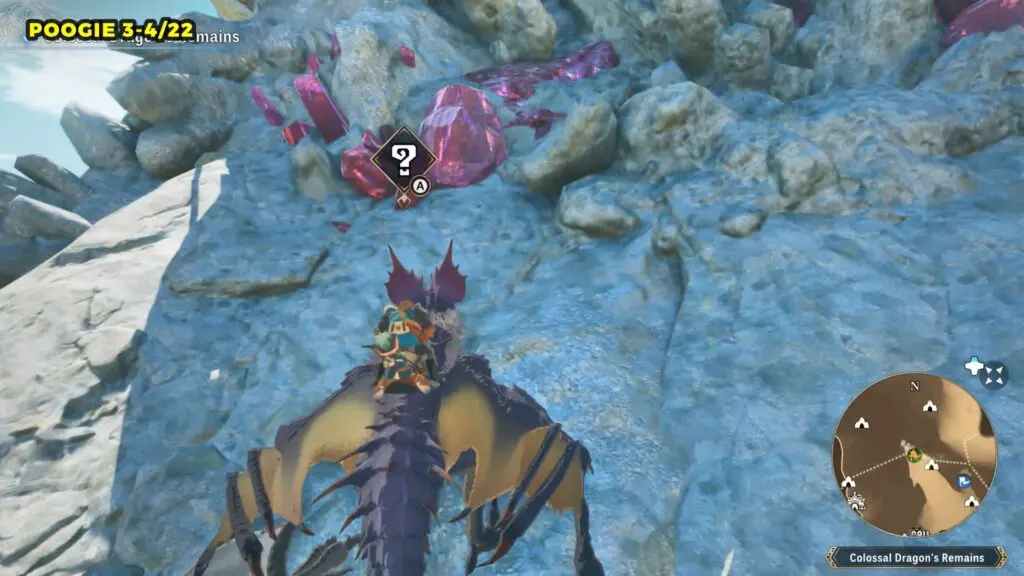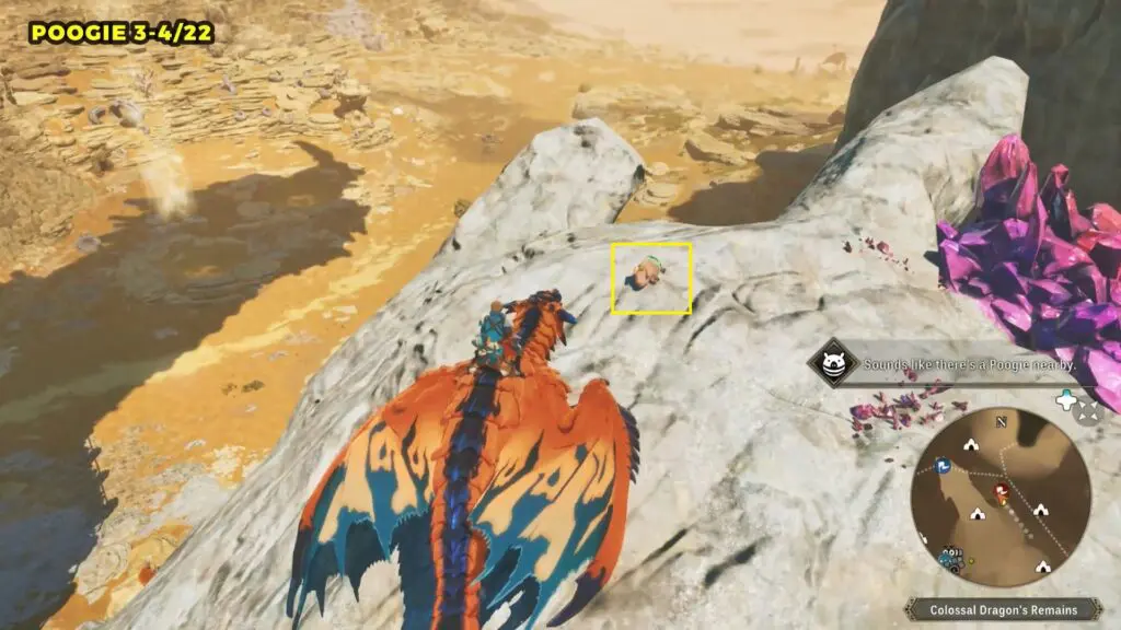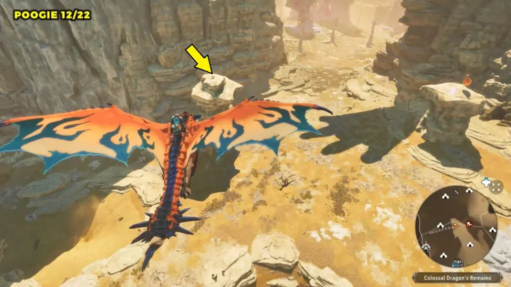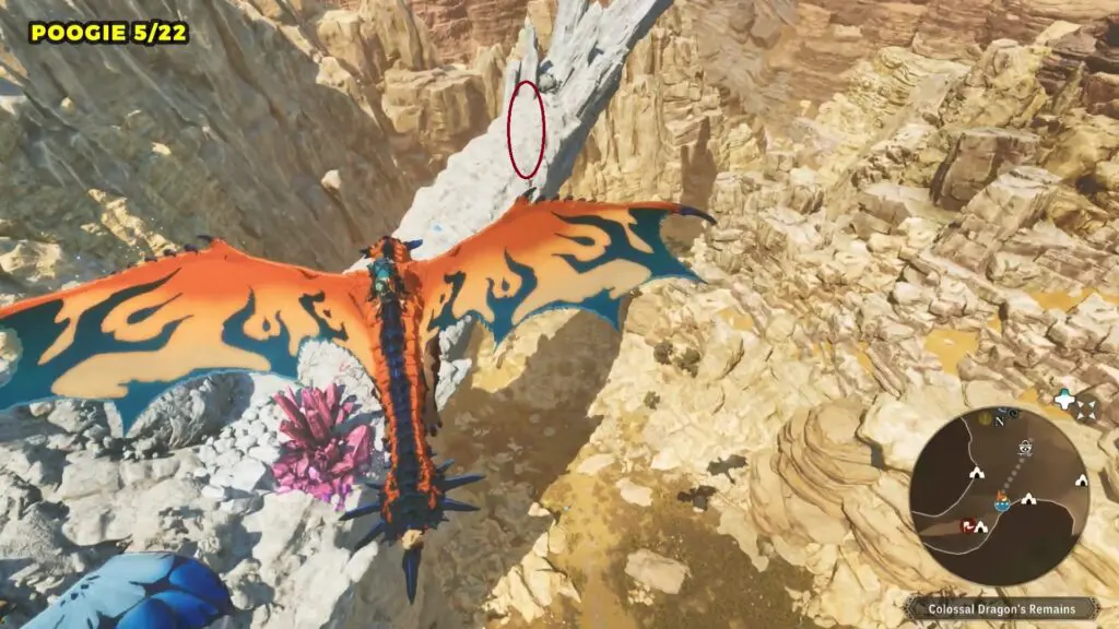 This Poogie is located on top of another rock pillar to the west of Colossal Dragon’s Remains. You’ll need to jump from a higher elevation and then glide over to land on top of the pillar.