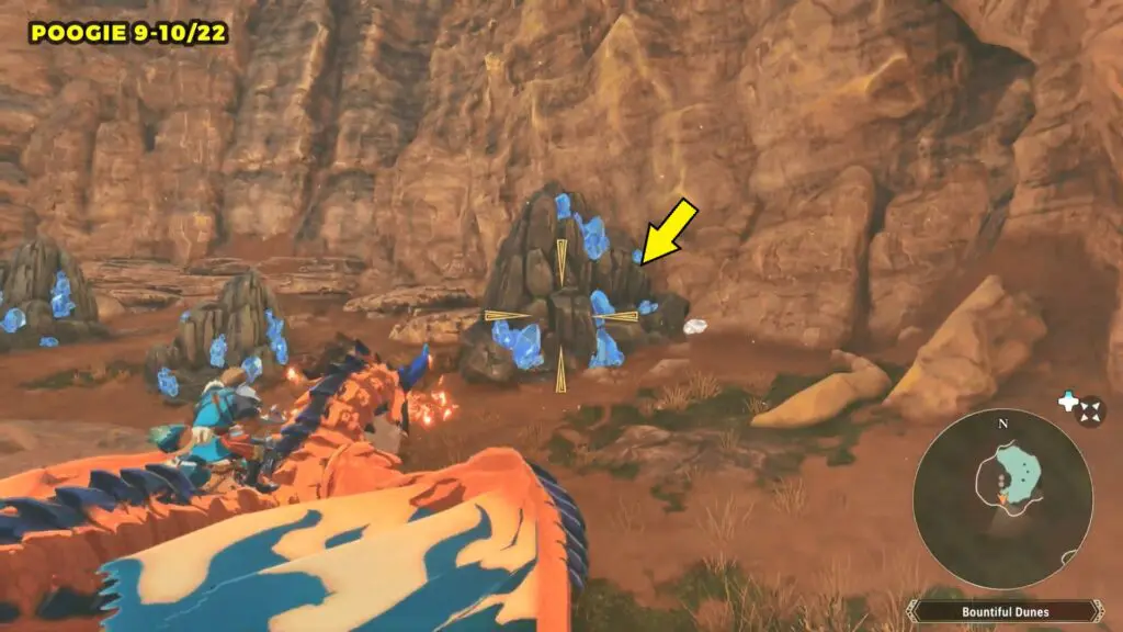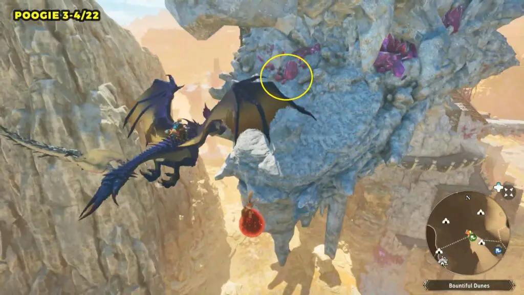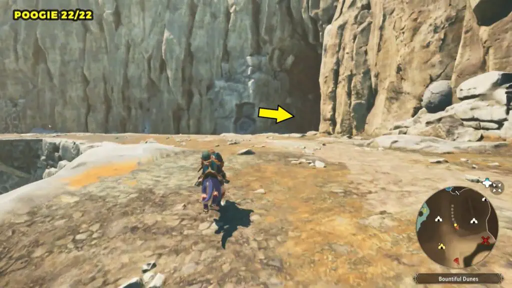 Head to the giant bridge on the eastern side of Bountiful Dunes, but don’t go downhill into the mine. Instead, look to the southwest for a path in the mountain wall and enter it. Follow the path all the way to the end to find the Poogie.