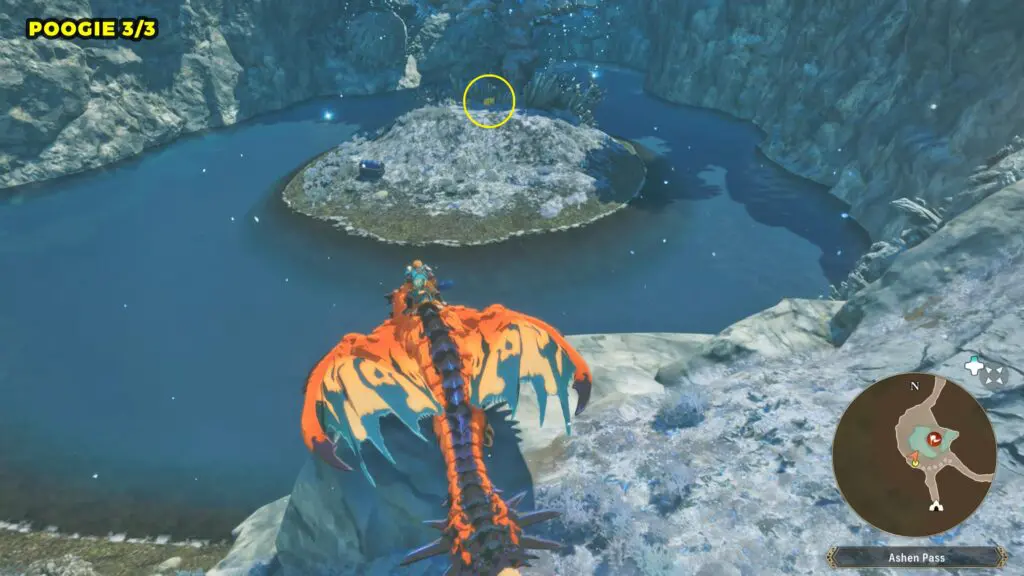 The third Poogie is located on a small island in a pond at Ashen Pass. Head to the marked location to find it.