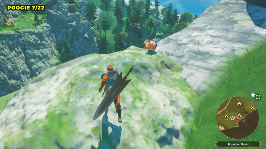 Head northeast from the previous location to find a big rock with blue crystals on top of the cliff. Break it to reveal the Poogie.