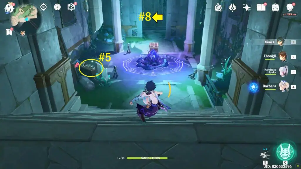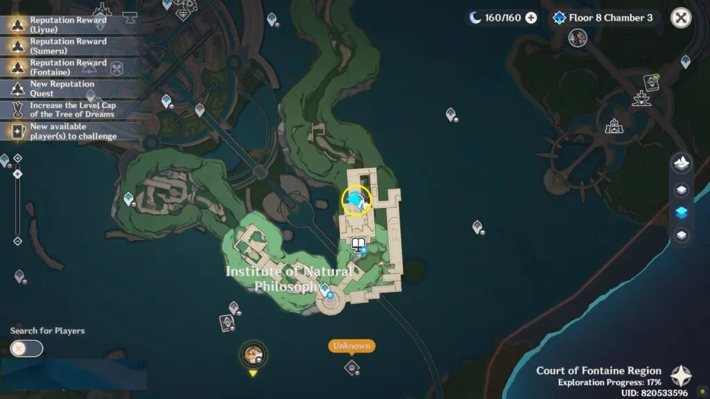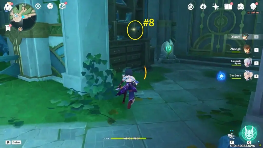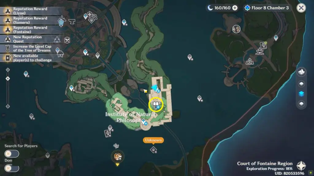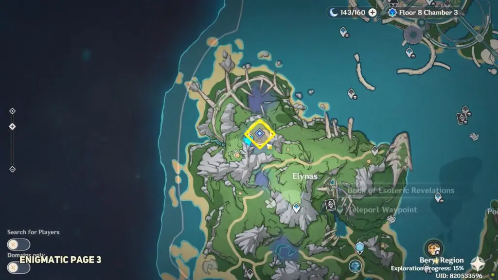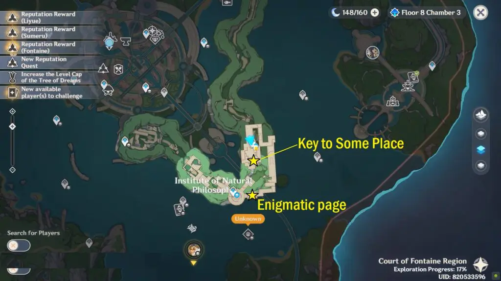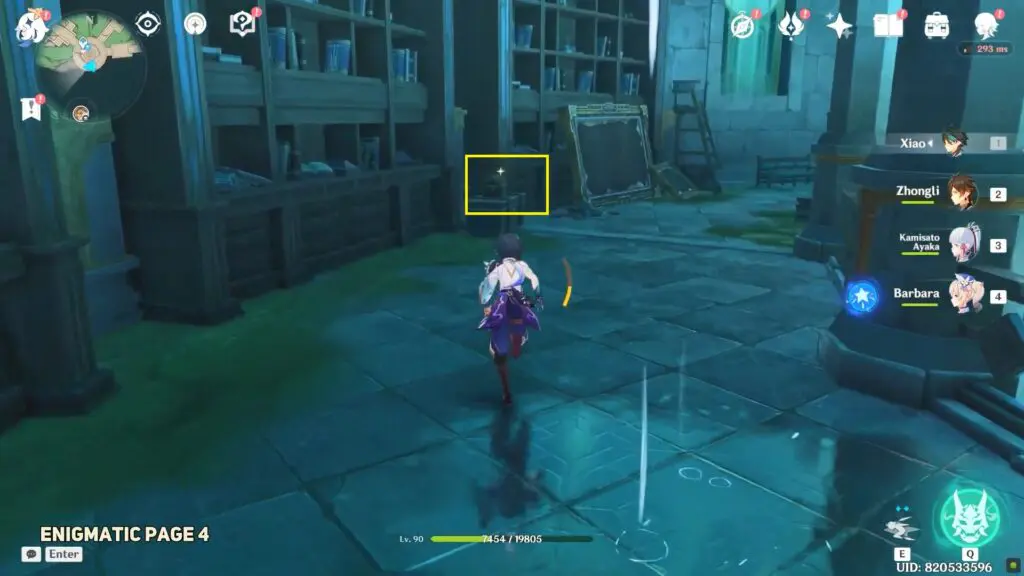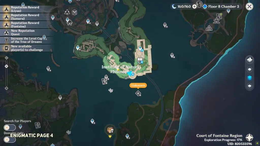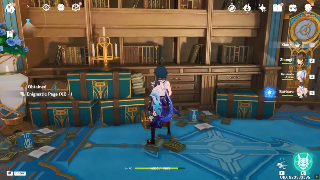 The sixth enigmatic page is in the Institute of Natural Philosophy Ruins’ final room. Enter the water rings to reach the top floor, then interact with the mechanism to unlock the door. The page is placed on the shelf.