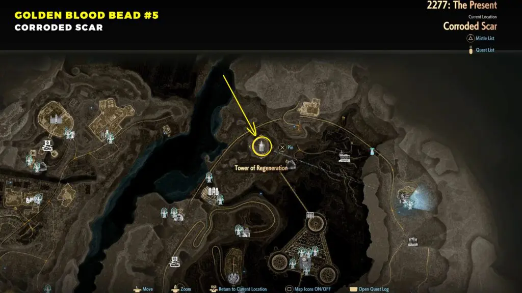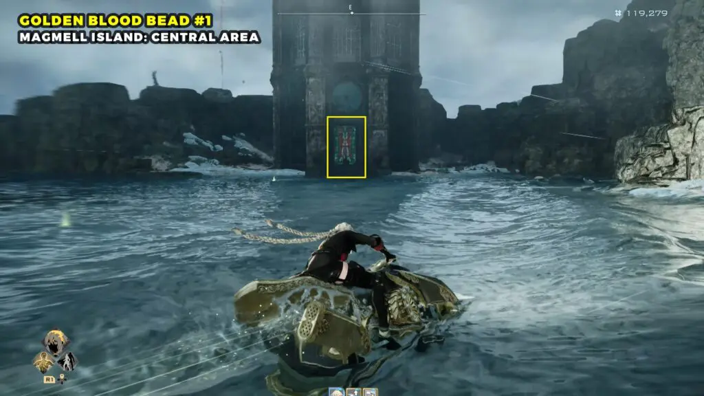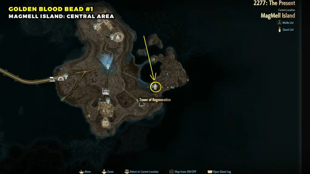 Start at the MagMell Island Center Area, then proceed east until you reach the edge. Then drop down toward the water below. Continue along the shore and enter the structure known as the Tower of Regeneration. Inside, you will find the first Golden Blood Beads.