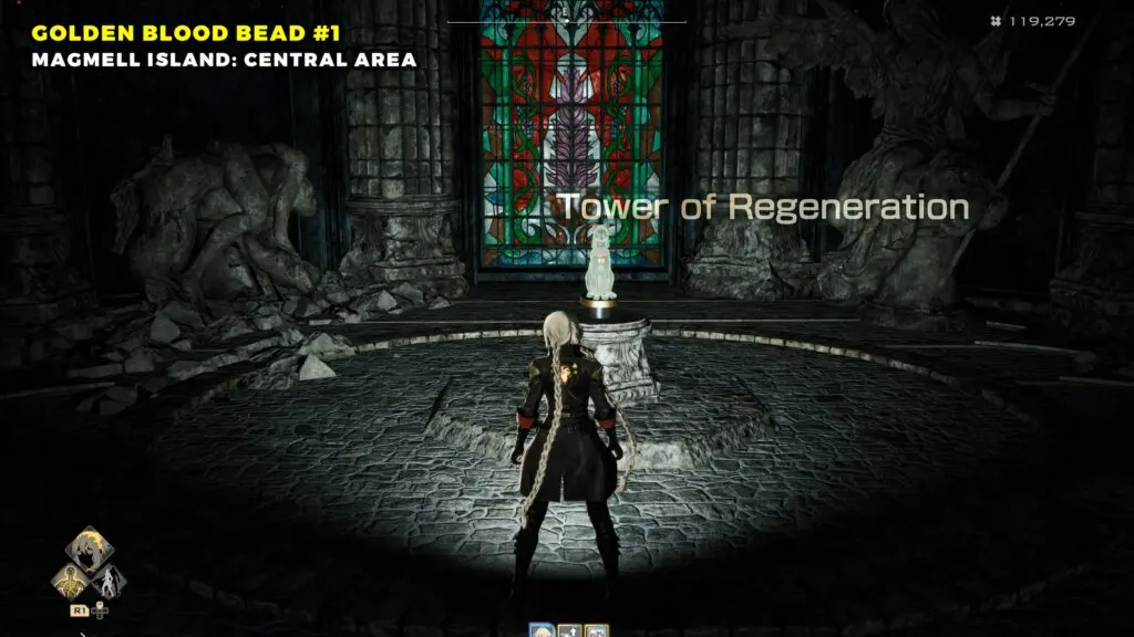Now, return to the center area and open the gate using the Cathedral Key. Go down the stairs to find the Tower of Regeneration.