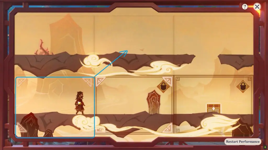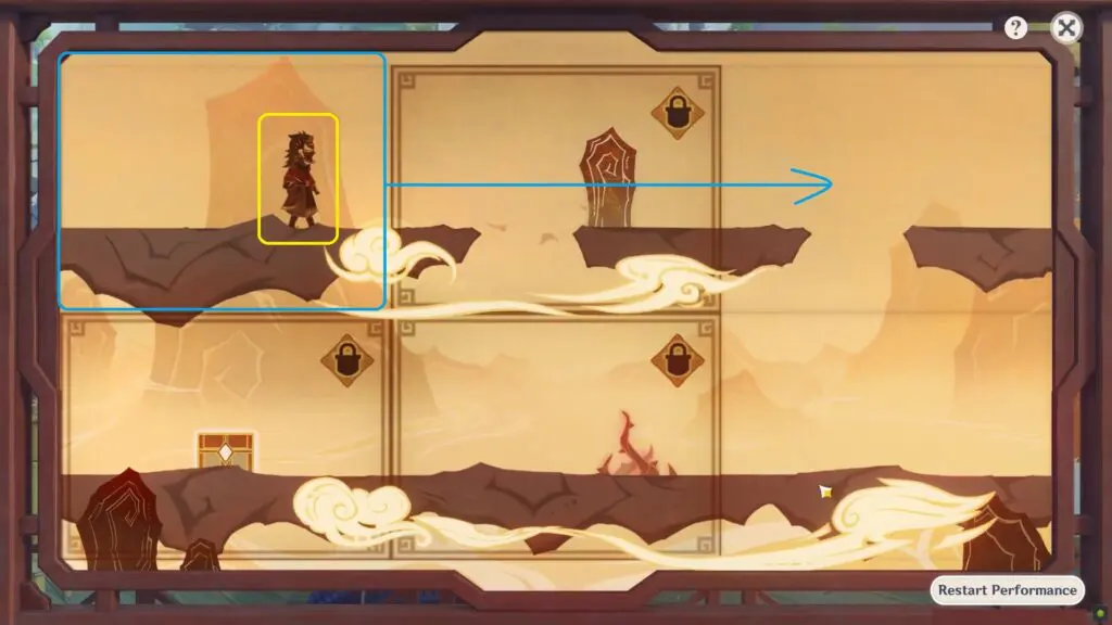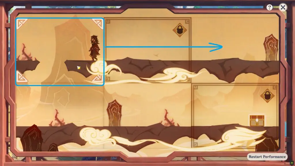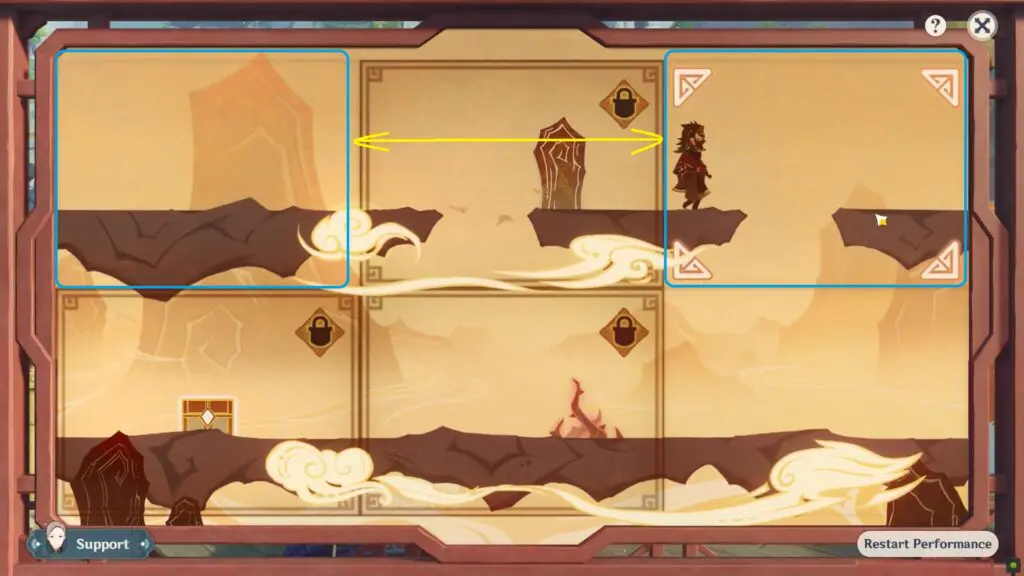 Then wait for the Oni to walk in the left direction and reach the upper-left block after hitting the obstacle. Swap the upper-left block (with air current) with the bottom-right to make the Oni reach its destination.