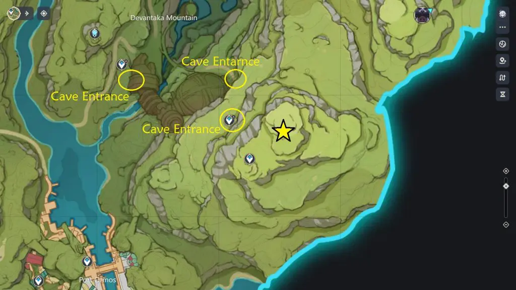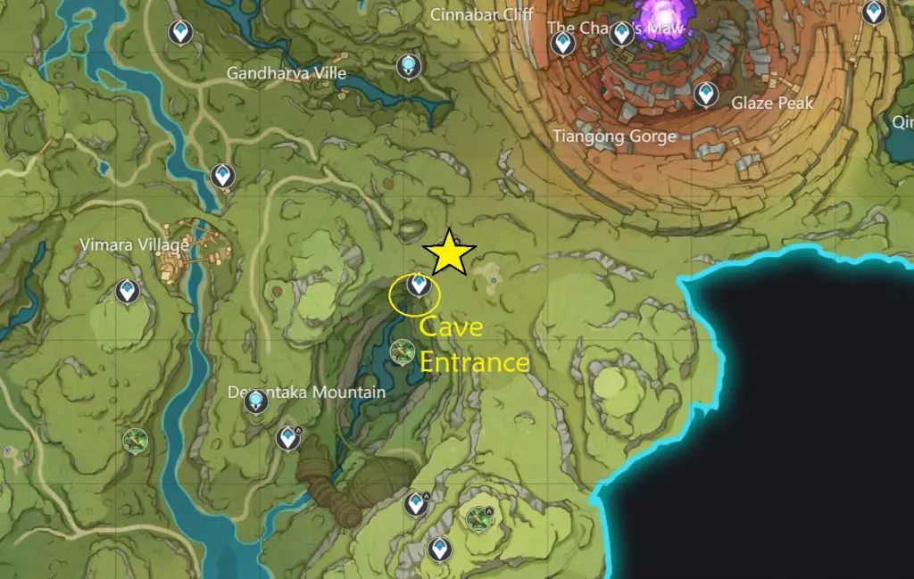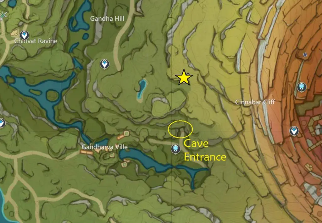 Located Northeast of Gandharva Ville. Once players have obtained the Kusava from the Agnihotra Sutra Quest, they can enter the cave. The cave entrance is north of the Statue of Seven in Gandharva Ville.