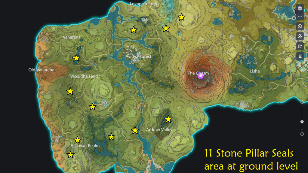 The two underground Stone Pillar Seals are located north of Pardis Dhyai and are inside the cave where the Legends of the Stone lock quest in Genshin Impact can be activated.