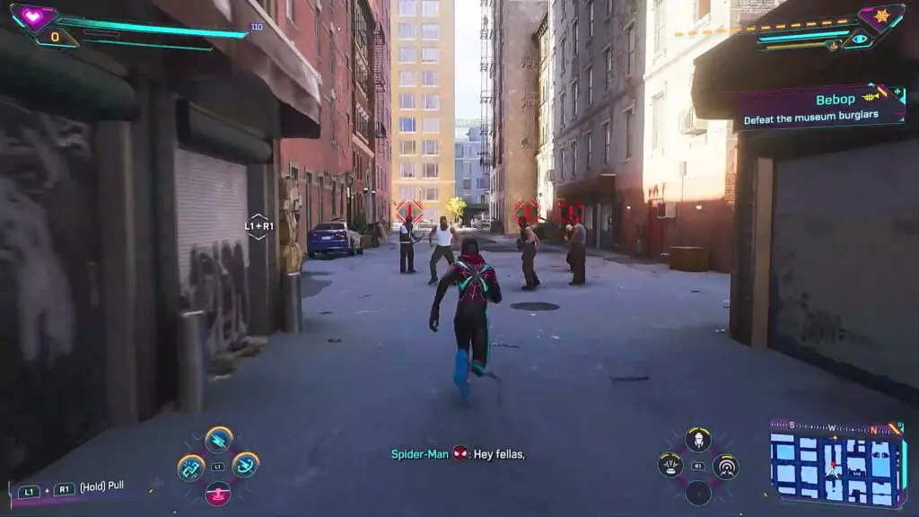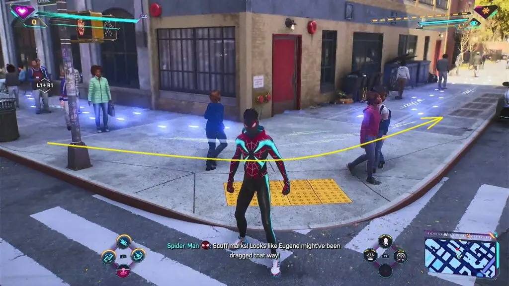 Open the door on the roof of the building as Miles at the location shown in the picture below to start the mission. Go to the museum and scan the puddle of fuel in front of the door. This will start a corruption puzzle. Destroy the red atoms, avoiding the destruction of green atoms to complete the puzzle. This will create a green trail. Follow the trail and it will take you to the museum burglars. Defeat the burglars, investigate the heist truck, and then check the mobile on the crate there.