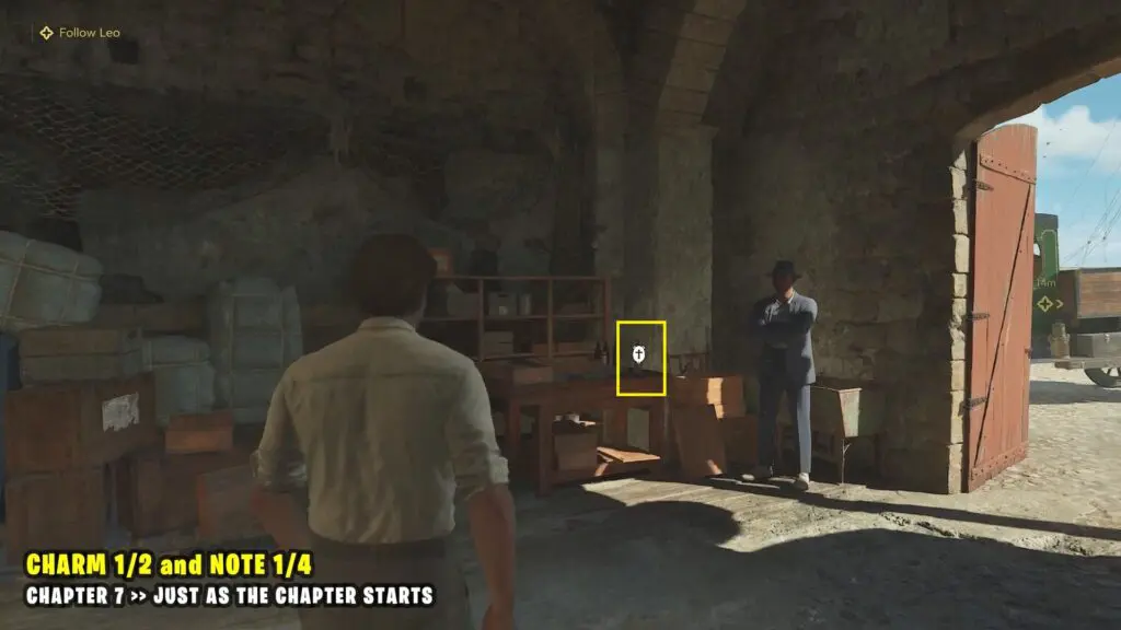 As you progress through the chapter, you will need to follow Leo. He will be standing near a blue gate. Go through the blue door where Leo is standing. Once inside, immediately turn left to find Charm #2 on top of a wooden crate.