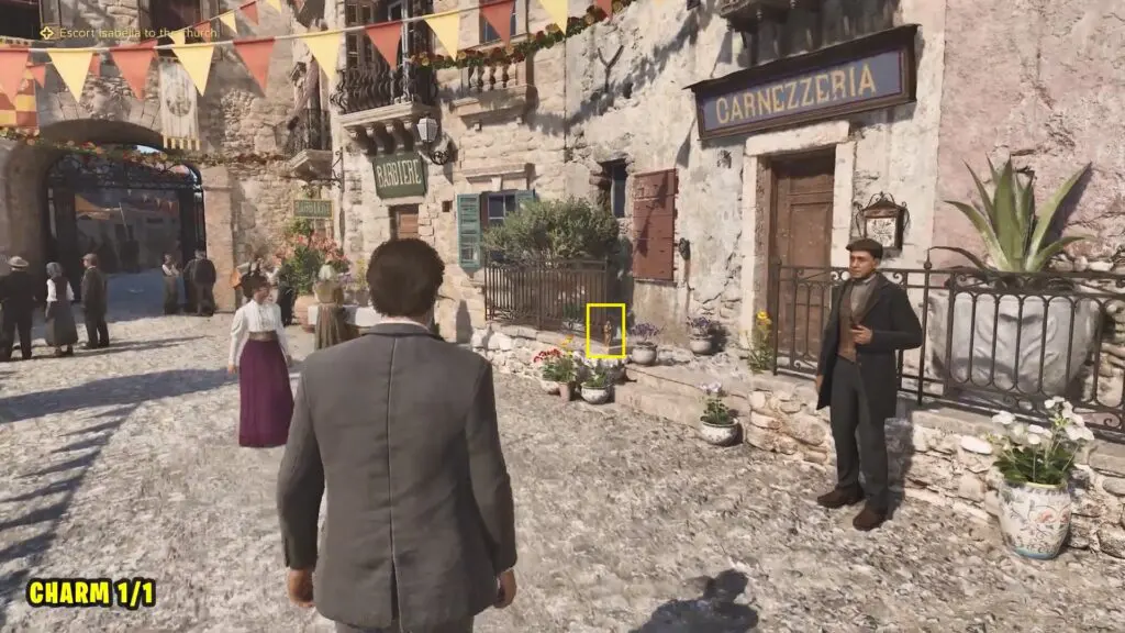 While escorting Isabella to the church, you will find Charm 1 in front of Café Carnezzeria.