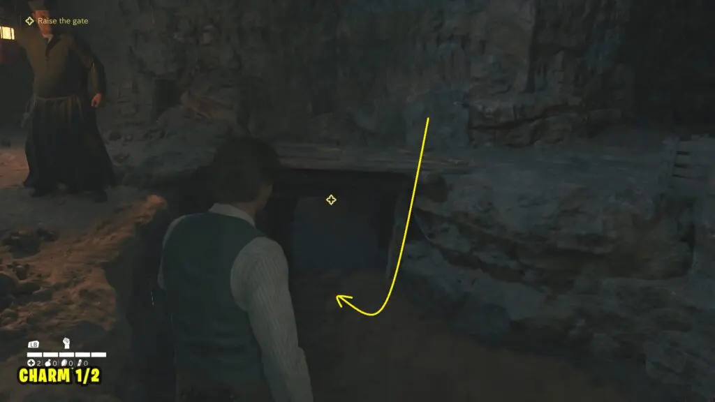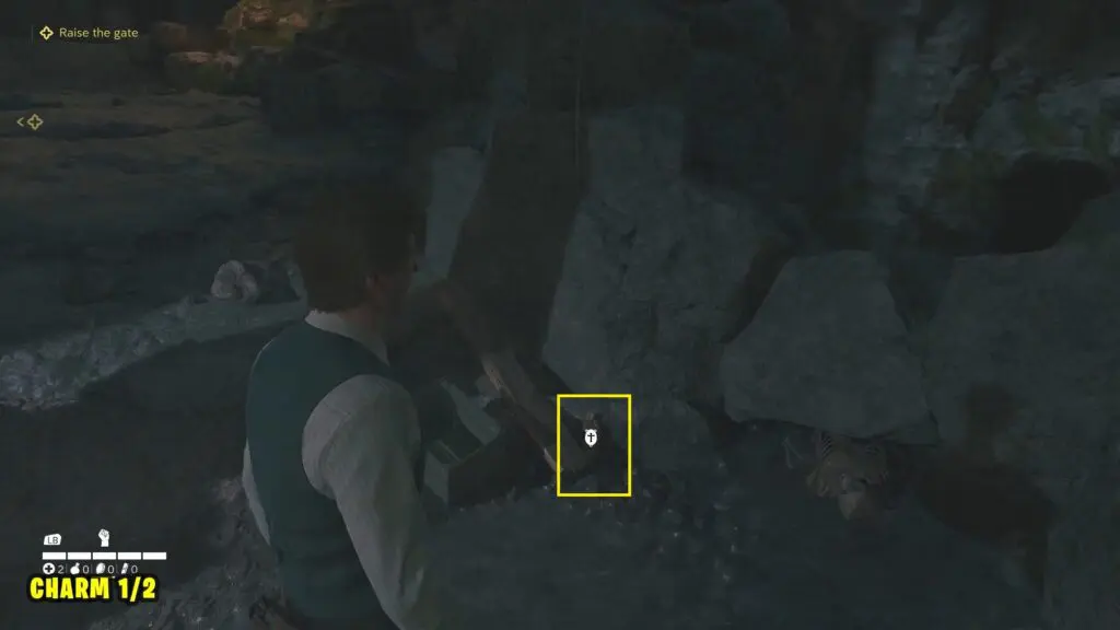 Proceed to the objective “Raise the Gate.” You’ll find Charm #1 lying on the ground beside the underground stream.