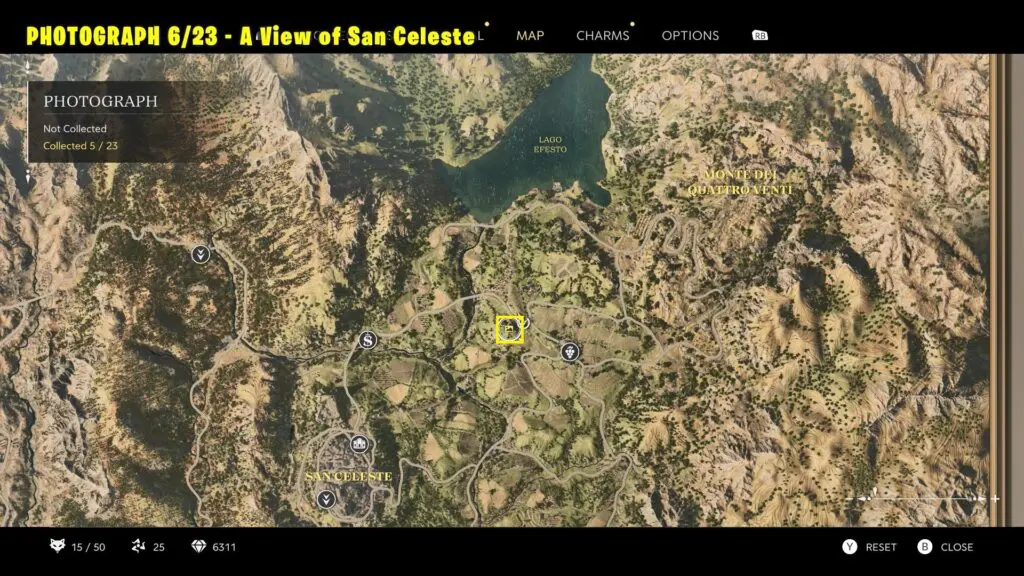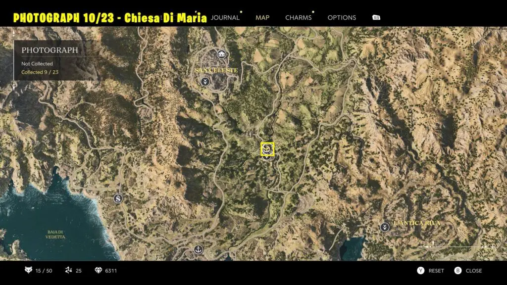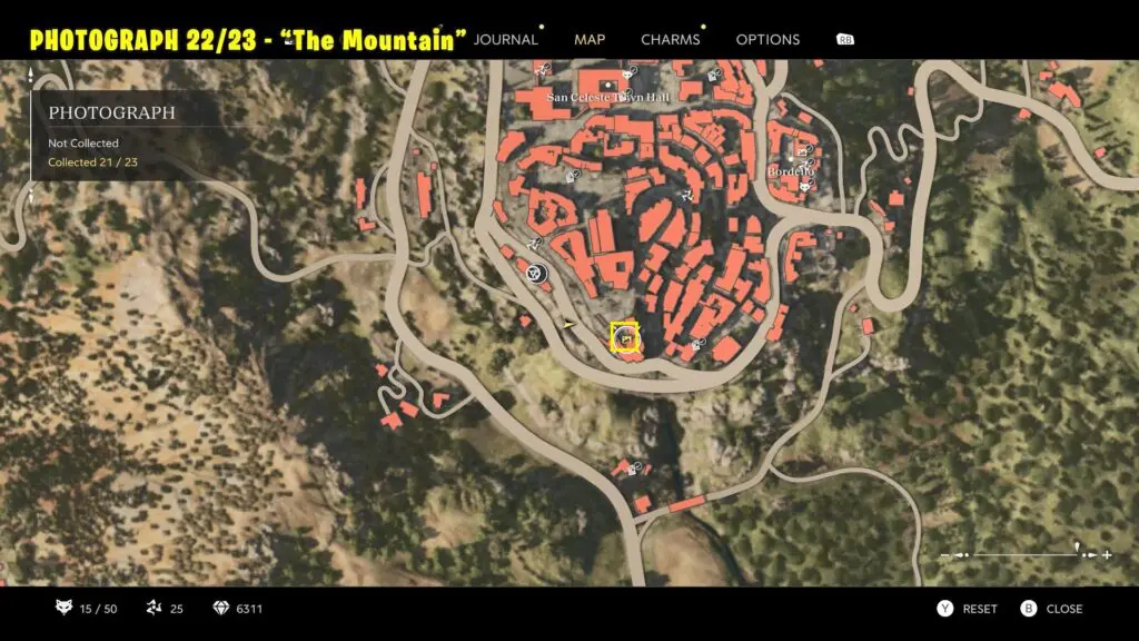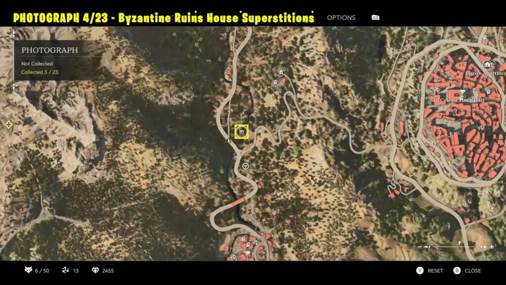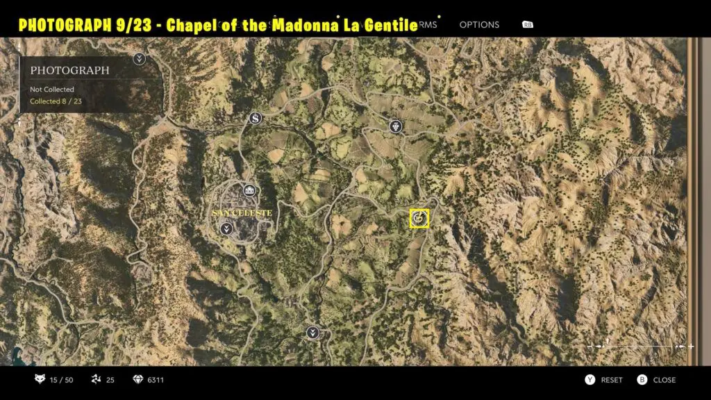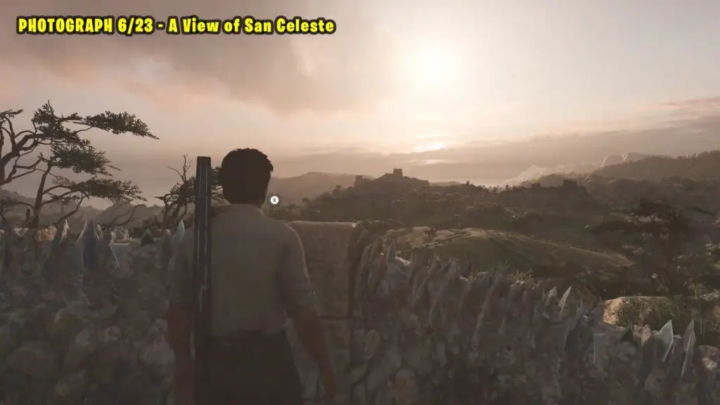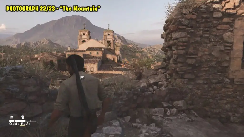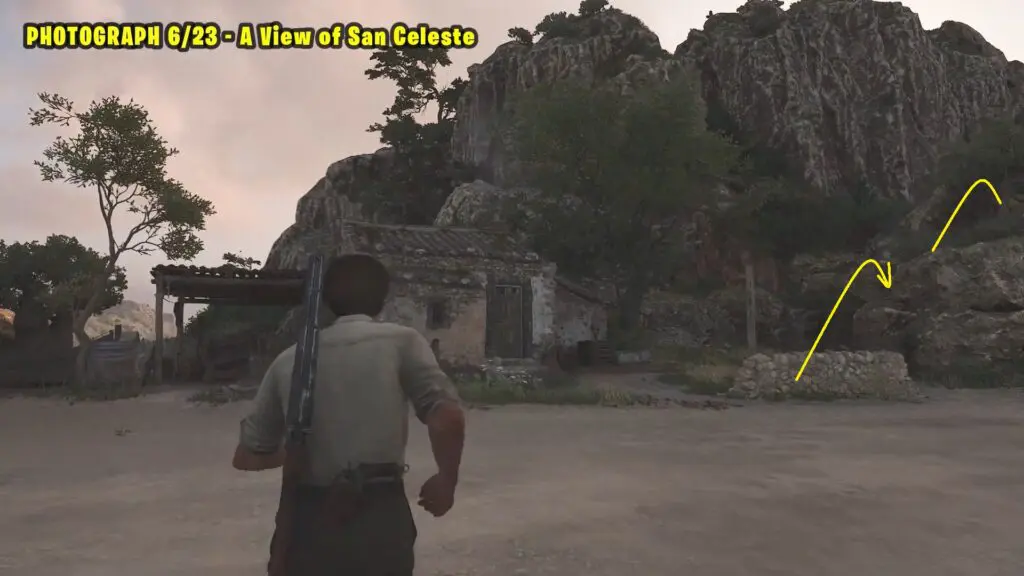 Head to the southern part of San Celeste, as shown on the map. Climb to the top of the marked building and take a picture of the chapel and the distant mountain. Refer to the image below.