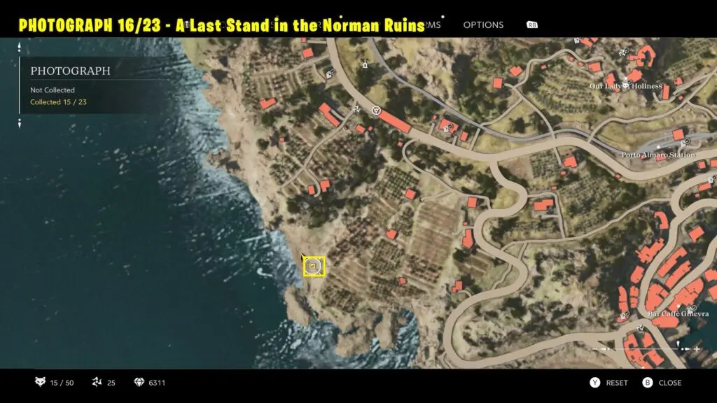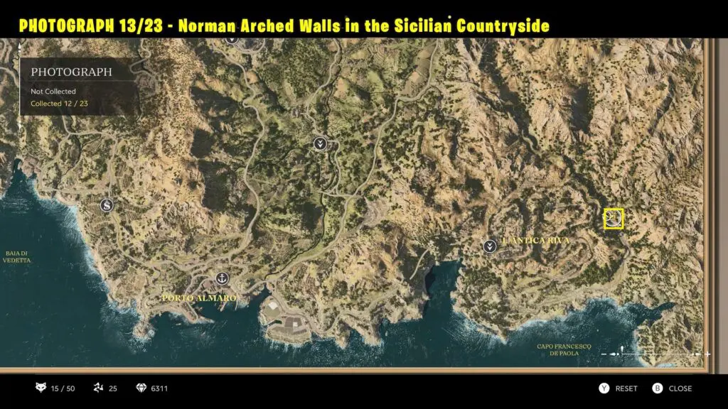 Head to the location east of L’Antica Riva, as marked on the map. Take a picture of the ruined wall in Norman Arched Walls.