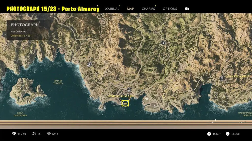Go to the beach west of Porto Almaro and take a picture of the ruins from the marked location. Stand near the rocks for the correct angle.
