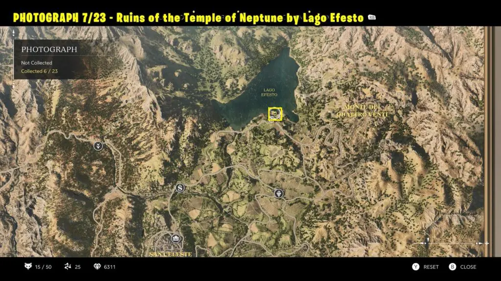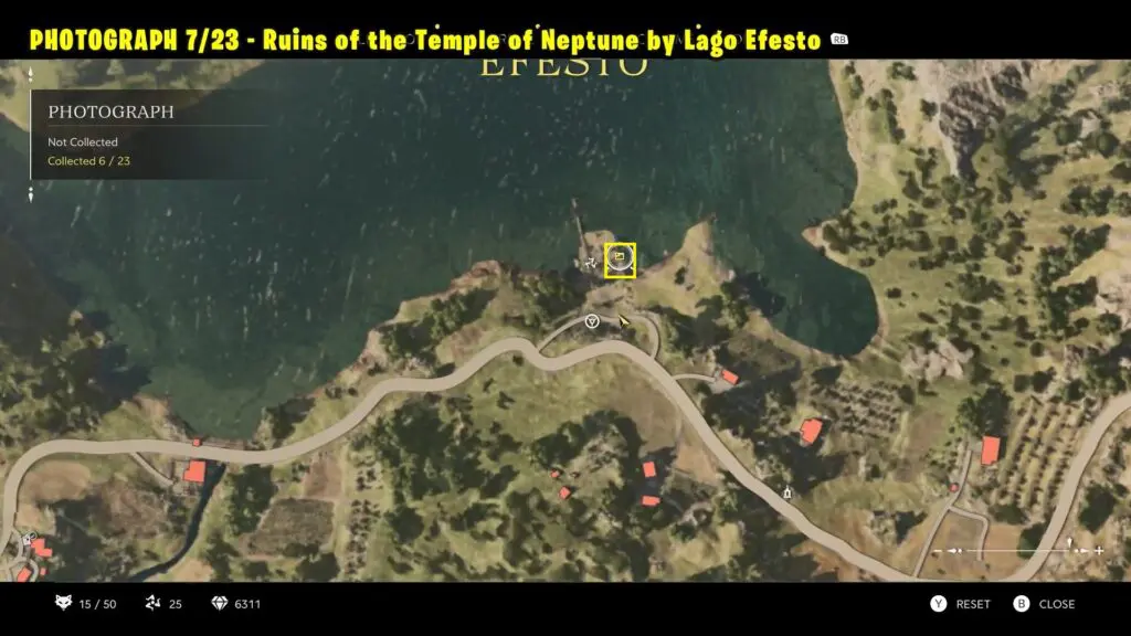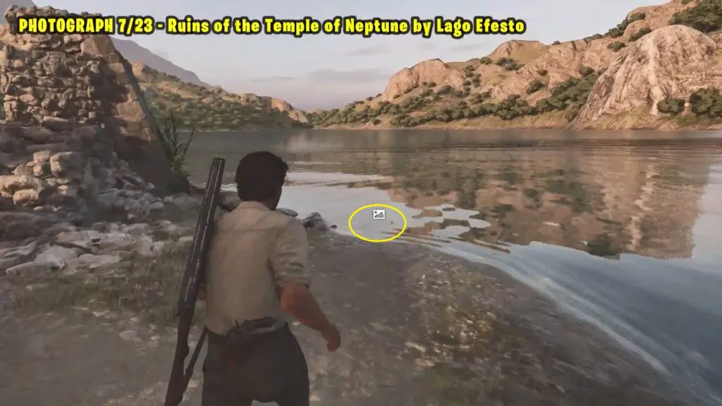 Head to the ruins along the southern shore of Lago Efesto, near the lake’s southeast corner. Refer to the map. Take a picture of the ruins from the lake shore.