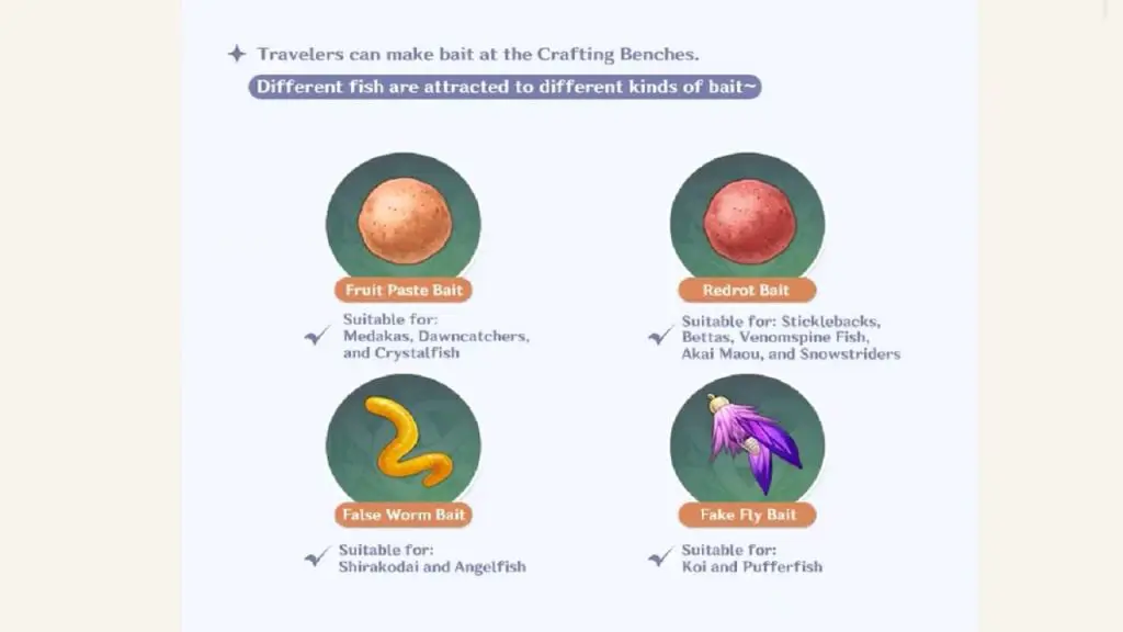 Redrot BaitThe blueprint can be bought from Nantuck of the Mondstadt Fishing Association with 3 Medaka fishes.1 x Dendrobium, 1 x Fowl = 10 x Redrot Bait