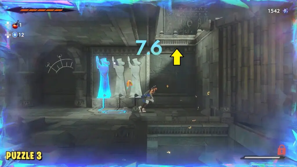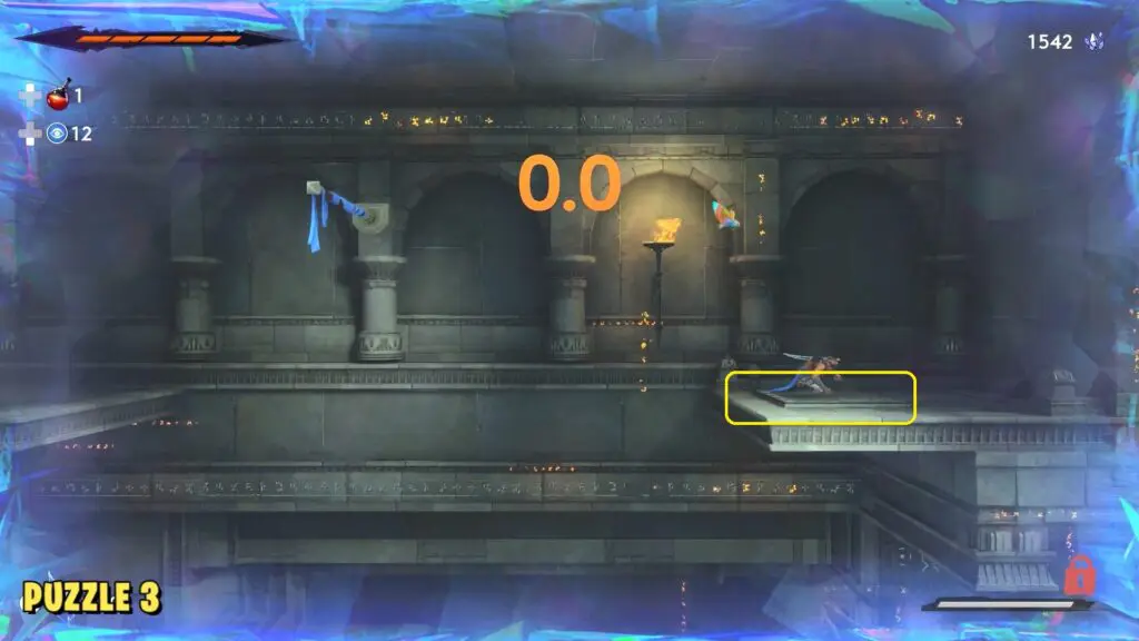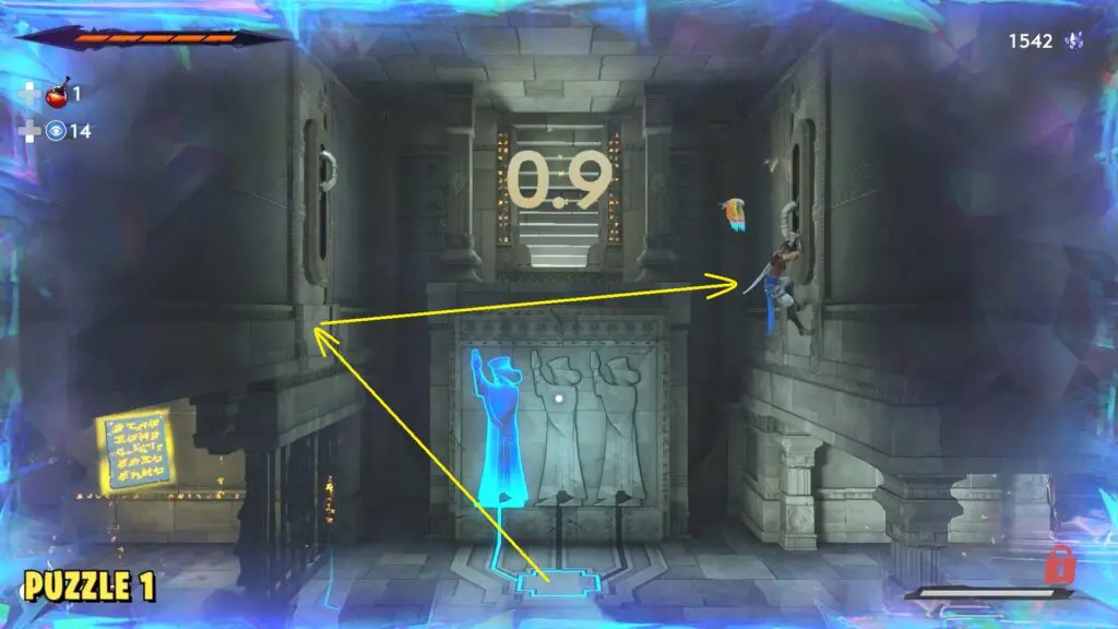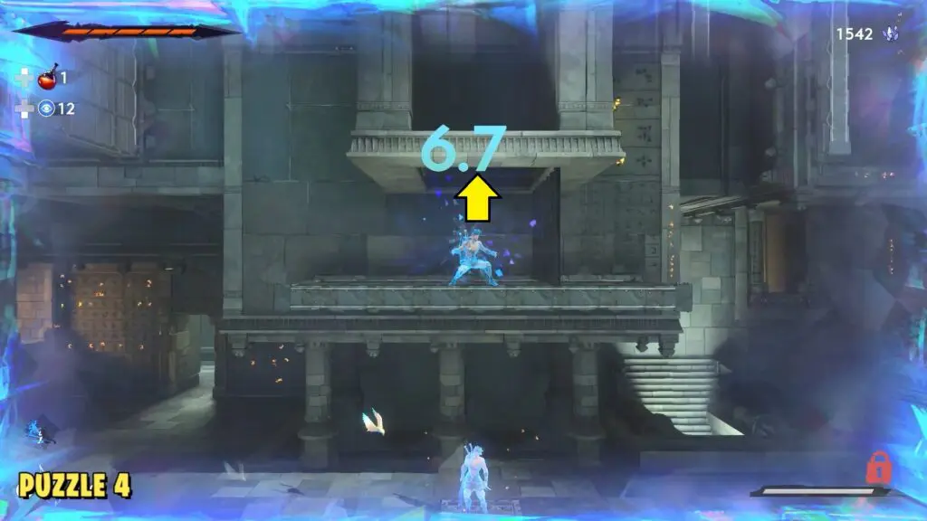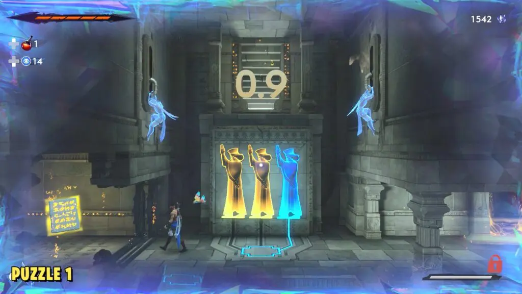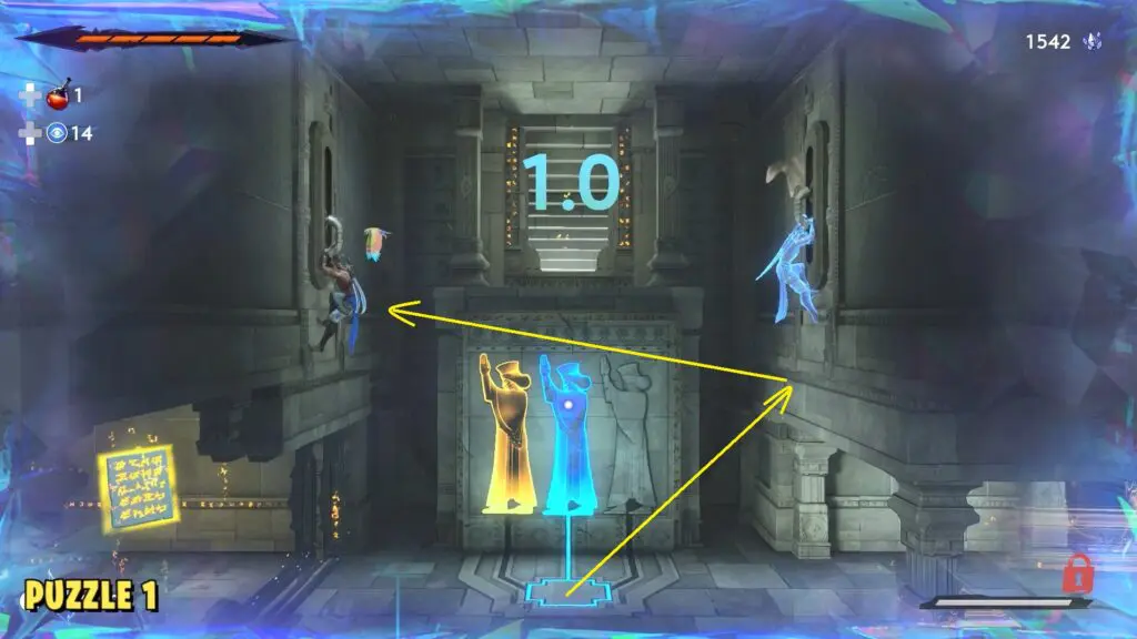 Stand on the pedestal near the statues and interact with it to start the puzzle. In the first movement, hop onto any of the walls and then use Rush of the Simurgh to dash to the opposite wall. Grab the lever and hold it down until the timer ends.