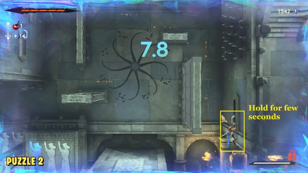Activate the puzzle, then swiftly navigate through the rooms: ascend and move to the right, change direction to proceed upwards and to the left, and finally descend into the U-shaped section along the left wall.