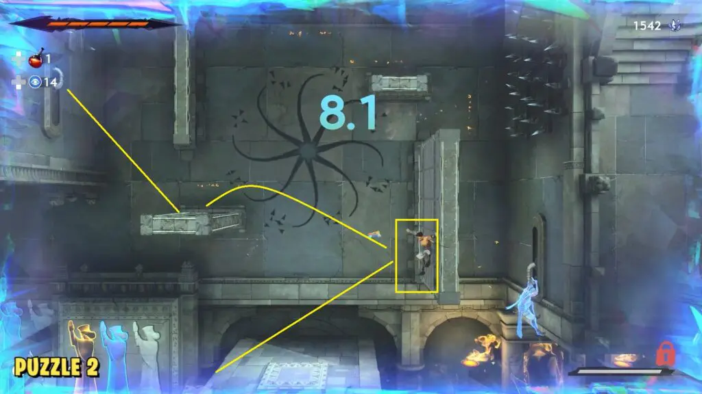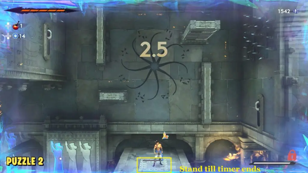 In the first movement, head to the right side and jump on the lever. Hold it down for a few seconds as this will slide out another wall for your next movement. Then hop back to the left to stand on the floor switch. Stay on it till the timer ends.