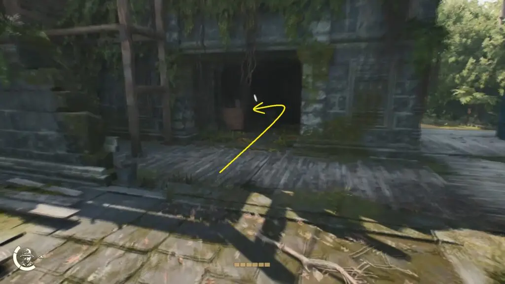 Make your way to the location marked along the river, where you’ll find a single, isolated building. Walk around to the back of the building, and you’ll notice a wooden beam covered with dry straw. Nearby, there’s a pot filled with oil. Pick it up and light it on fire.