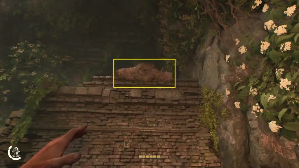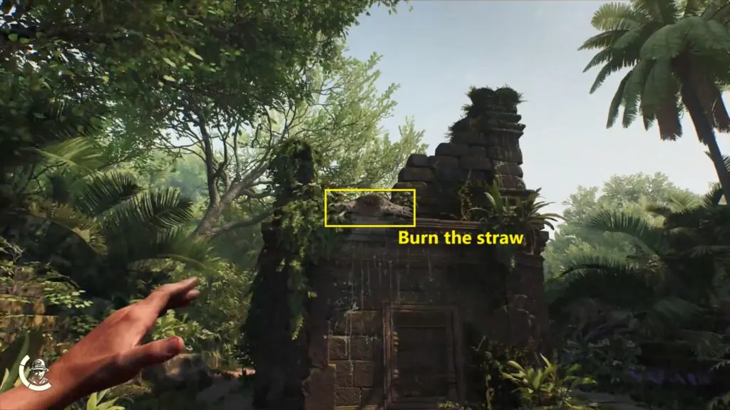 Look to the left-hand side to see a beam covered in dry straw. Burn the straw to expose the beam. Climb up the ledge to find the artifact on the left side.