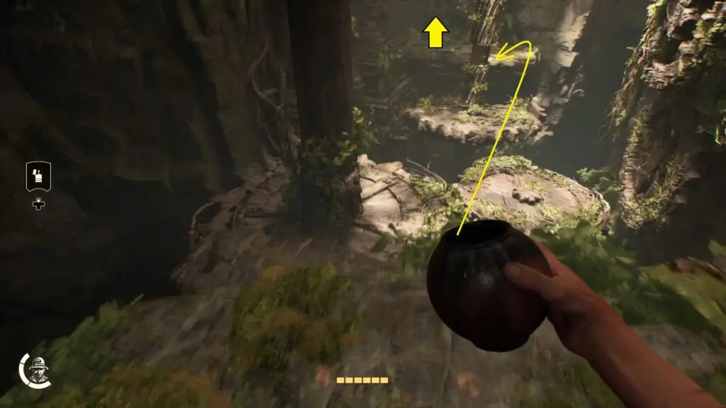 Carefully throw the burning pot onto the straw to burn it away, revealing the wooden beam. Climb up the beam and enter the building. Inside, you’ll discover the artifact waiting for you.