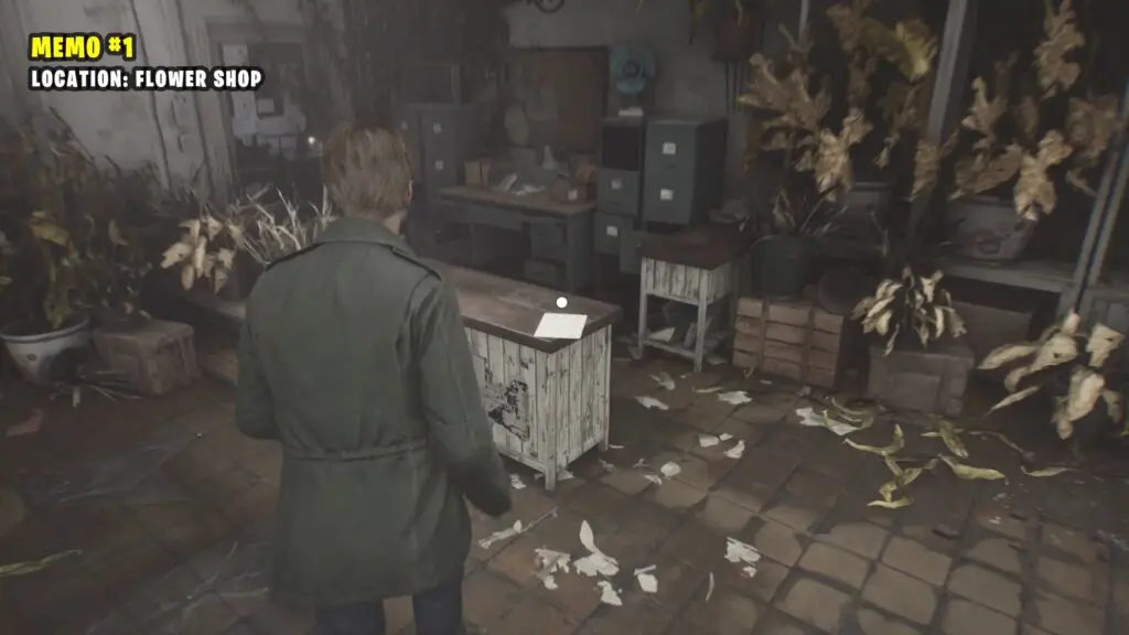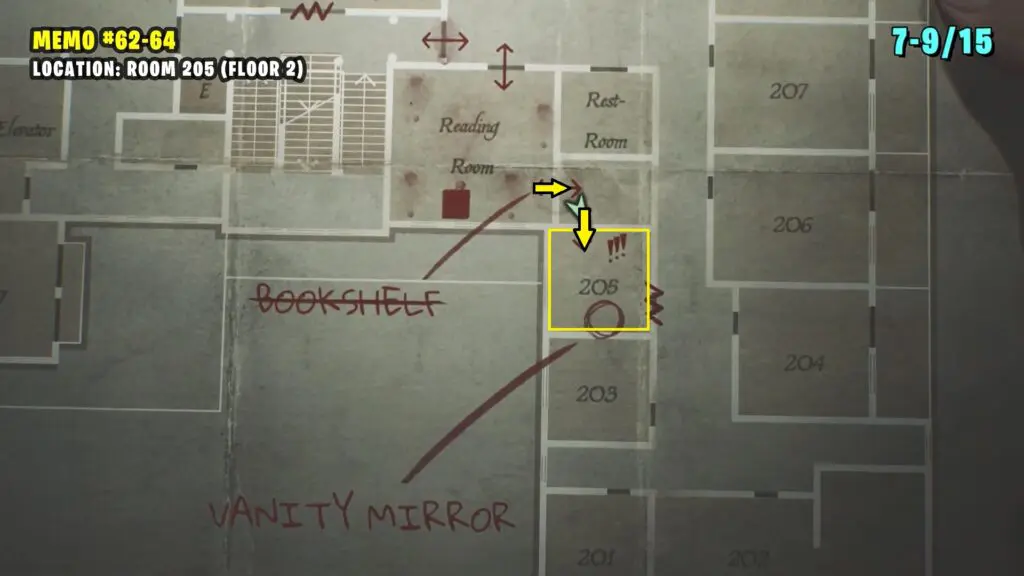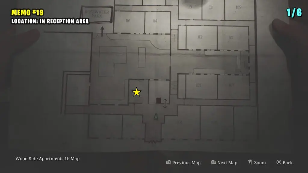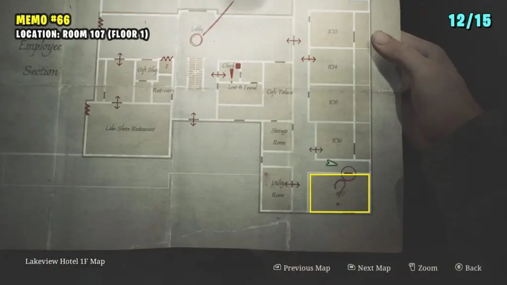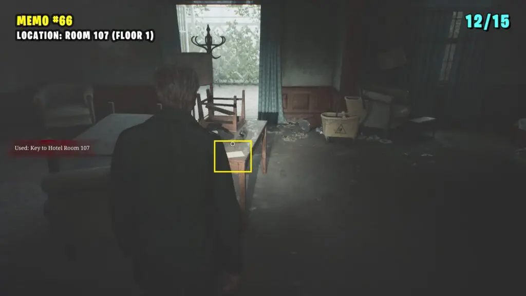 Once inside, break through the damaged wall to reach Room 107. You’ll find a memo on the table.