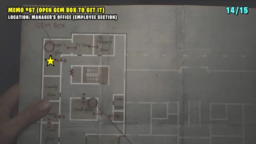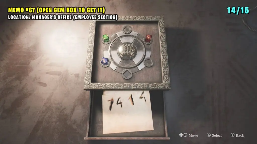 Solve gemstone puzzle in the Manager’s Office to get Memo #67: Keypad Numbers Memo