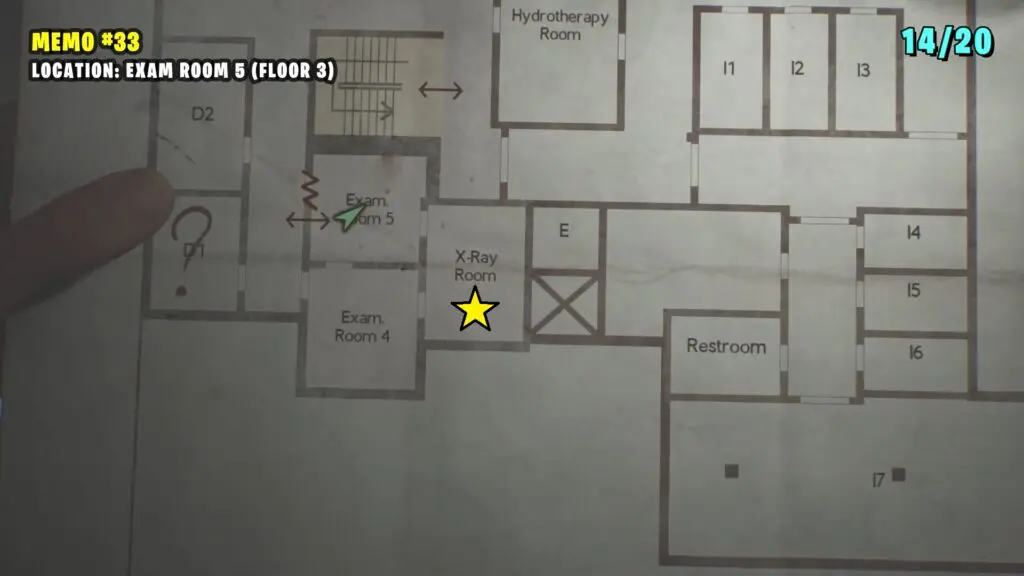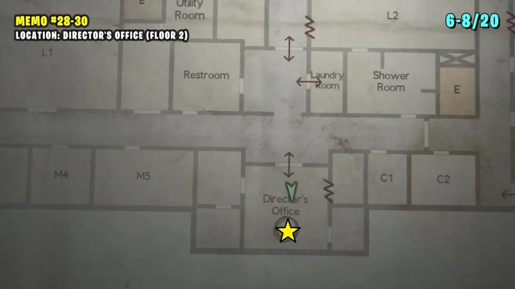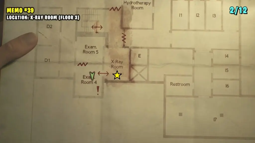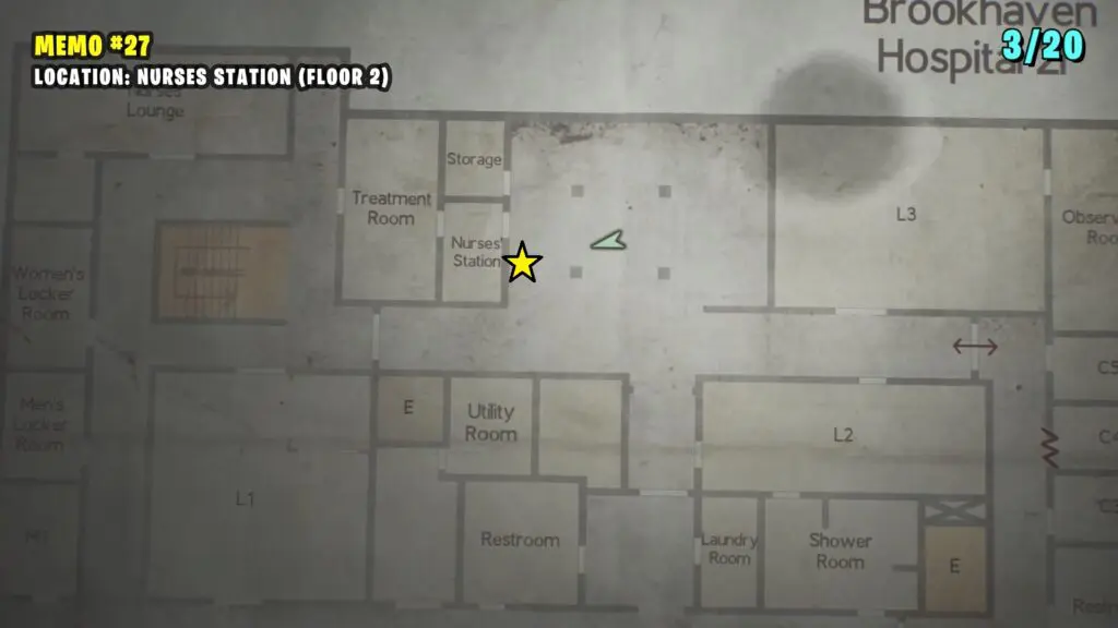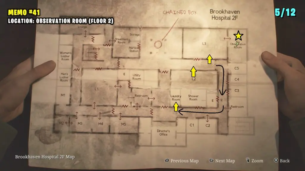 The patient’s Note is in the Observation Room, the player can retrieve a climbable box from Room L2. Follow the path shown on the map below to enter the Laundry room by breaking the Wall. Enter the L2 Room.