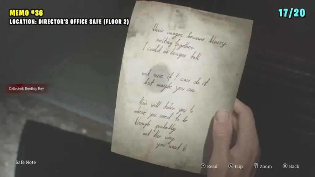 Enter the hotel and head downstairs to the basement. In the Utility Room, you’ll find a memo on the table.