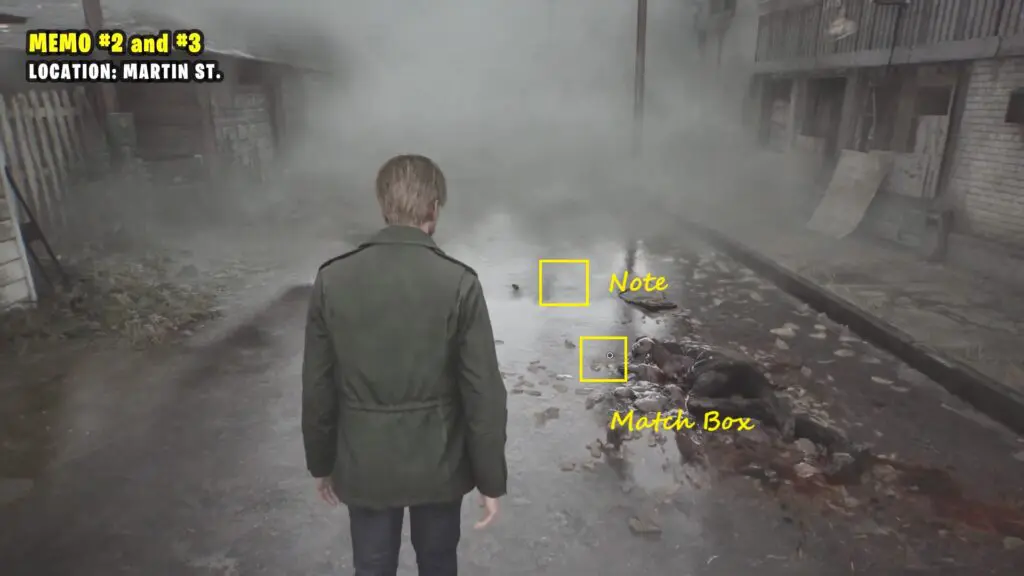Interact with the corpse on the floor of Martin St. Nearby, you’ll find two memos: a note and a matchbox.