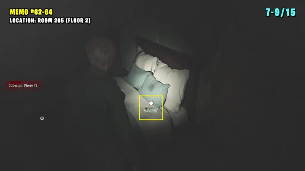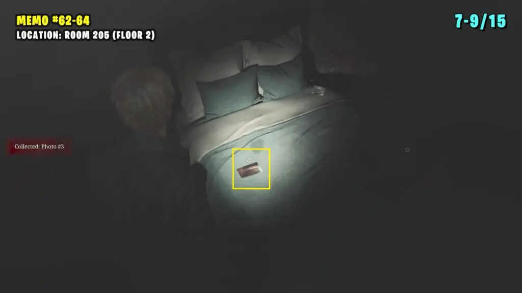 Make your way to the Reading Room on the second floor and solve the bookshelf puzzle to reveal a secret door leading to Room 205. Inside, you’ll find three photos near the bed.