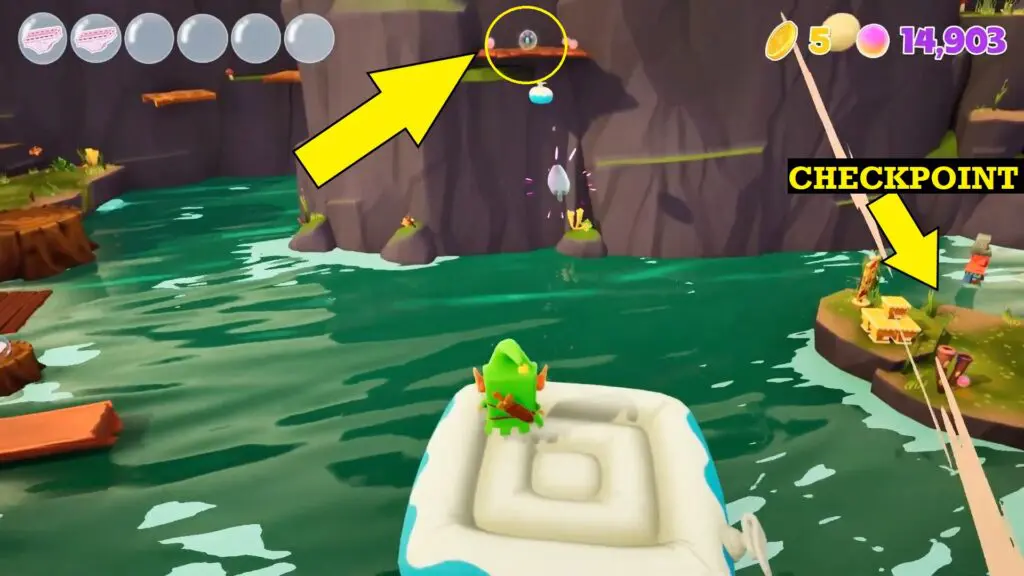 Look to your right while facing the checkpoint to discover the spot’s hiding spot on a ledge. Go to the other side of the river and board the hoverboard using the inflatable pad. Then, using the hoverboard, travel to the opposite side of the river to locate Spot on a ledge.