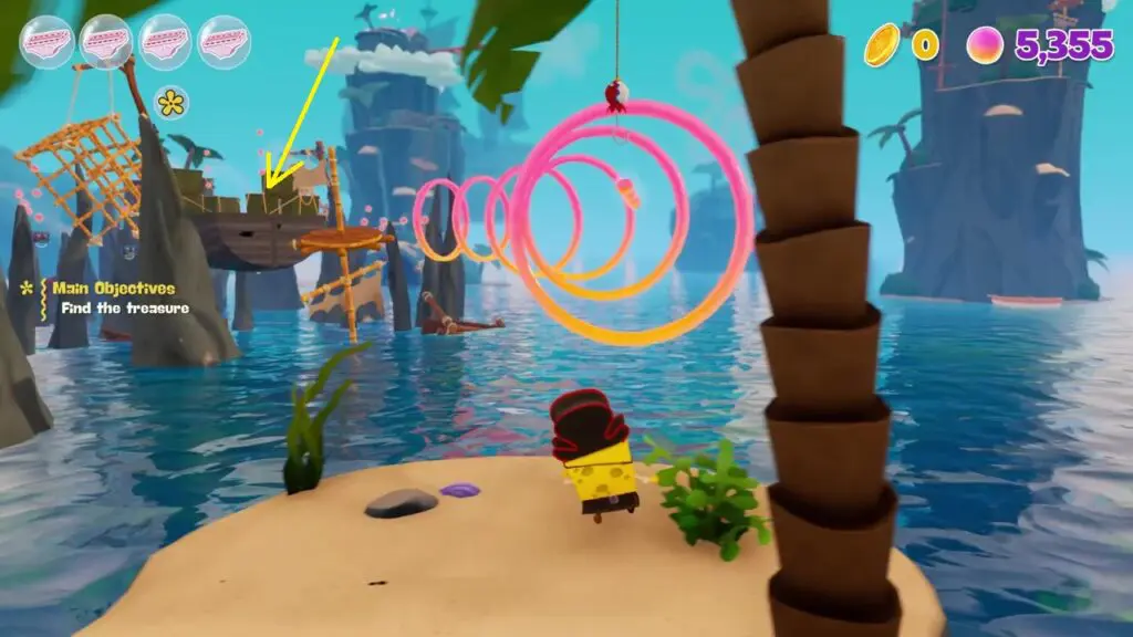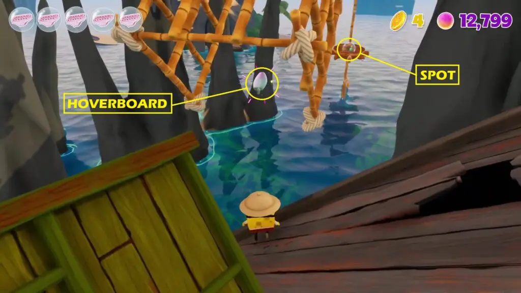 Go to the tilting ship, which you use to get to the treasure for the main objective, as shown in the picture below. Then ride the hoverboard under the cage on the right side to reach Spot’s location as shown in the second picture below.