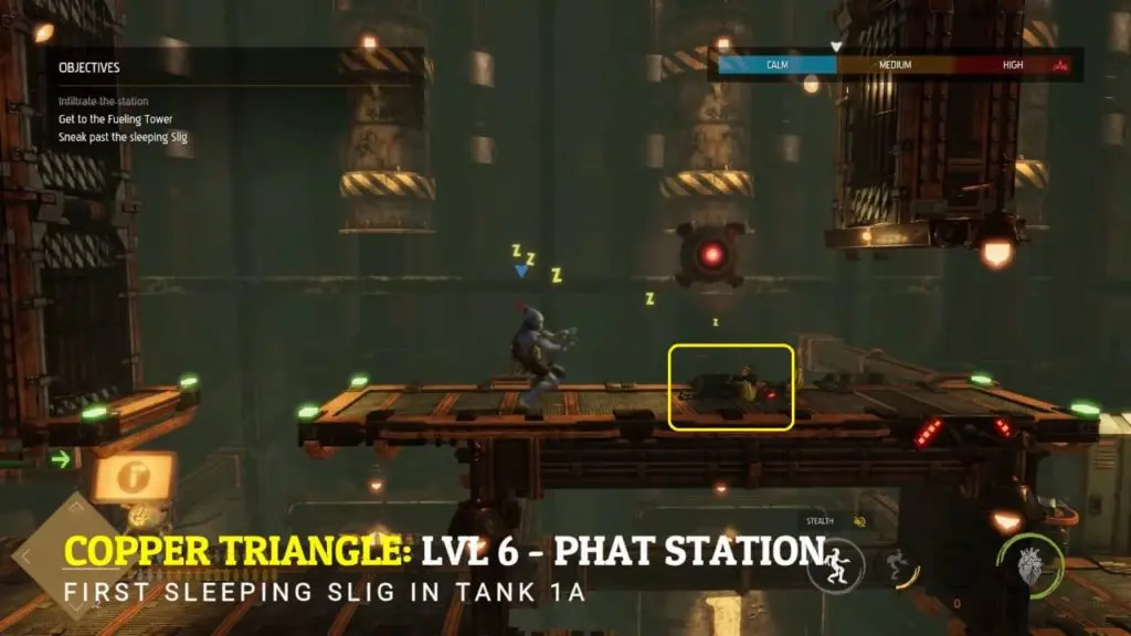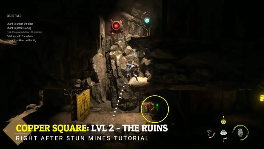 You can find the key on the first Slig, right after the ‘Stun Mines’ tutorial. You will also get an objective to use ‘Stun Mines’ on a Slig.
