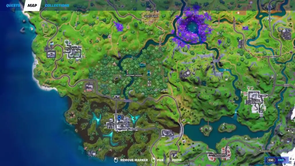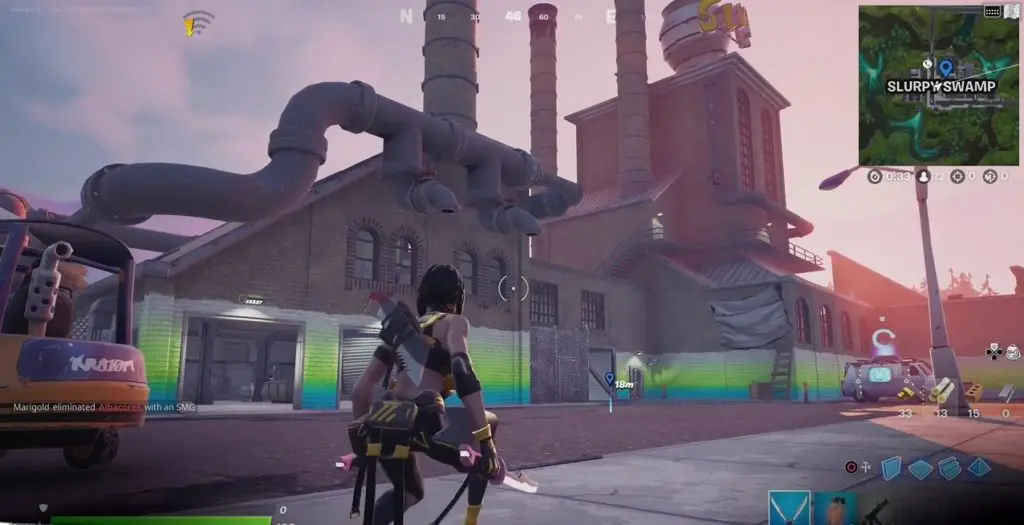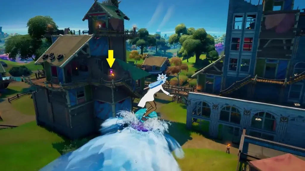 The second alien artifact can be found in Slurpy Swamp which is at the southwest portion of the map. In Slurpy Swamp, the artifact is at the location as shown in the picture below. It is inside the building with a single chimney. Enter the building and climb up the upstairs. The artifact is in the upper corner of the room as shown in the picture below. You might need to build to reach the artifact.