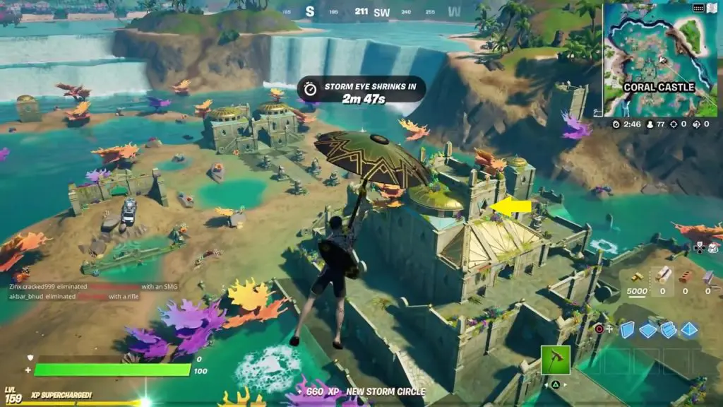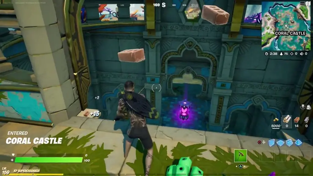 The third alien artifact is in the Coral Castle which is at the northwest portion of the map. The artifact is in the tall building at the center of the coral castle as shown in the picture below. If you enter from the bottom of the building you will have to build all the way up to the top to be able to get the artifact. It’s easier to fly down at the top, break the wall, and then reach the artifact.