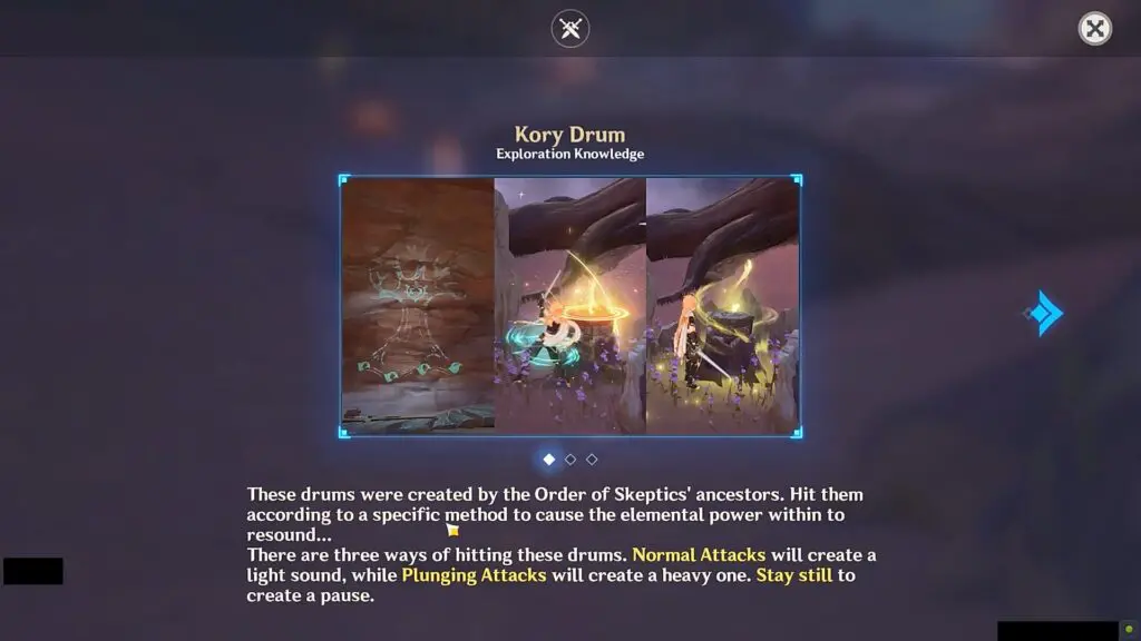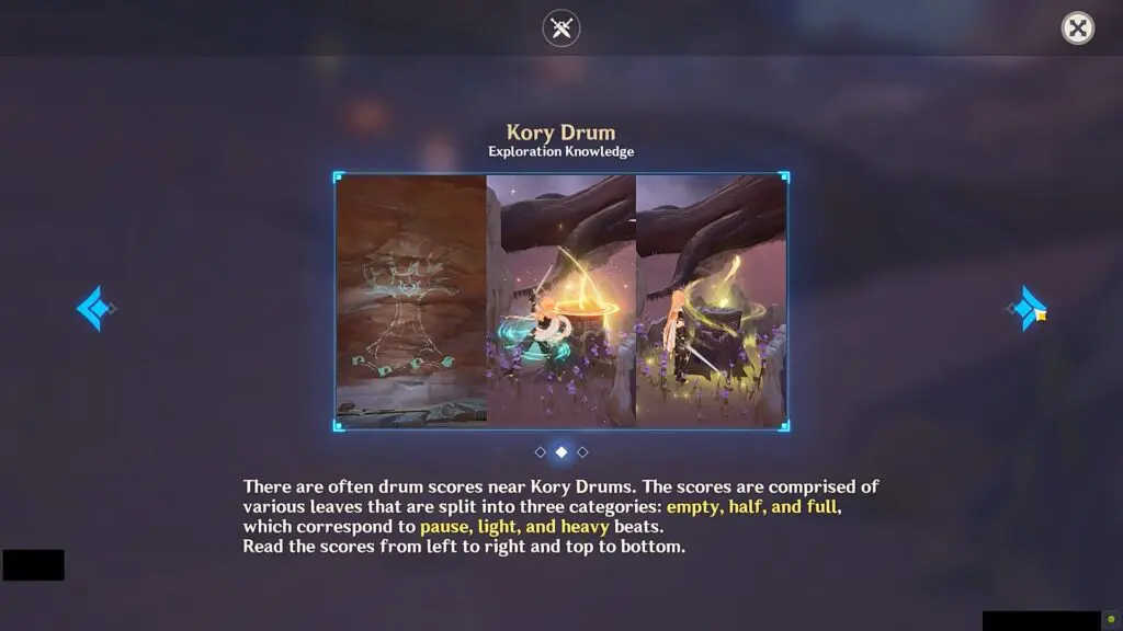 You need to perform as per the drum score to complete the puzzle. When the light glows above the drum, it represents one beat. You can take three actions as the beat appears: Normal Attack, Plunging Attack, or Stay Still. Take the actions as per the drum score to complete the puzzle. The drum score consists of three types of leaves: Empty, Half, and Full, which corresponds to Stay Still, Normal Attack, and Plunging Attack. The solution to all five Kory Drum puzzles is shown below in the article.