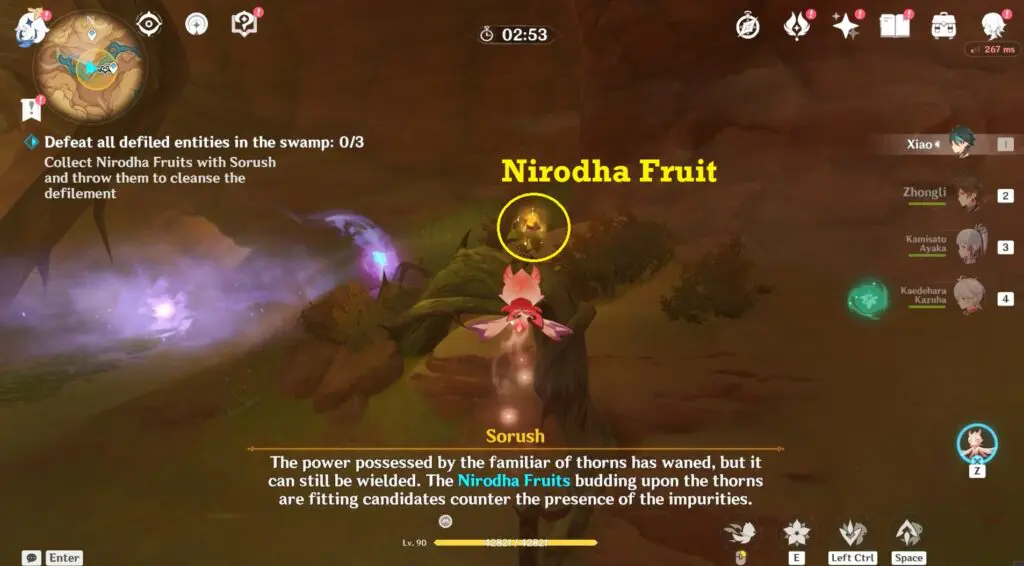 To complete this time trial, players must find and collect Nirodha Fruits and utilize Sarush’s throwing ability to clear the defiled entities. These fruits can be found near the thorny branch.