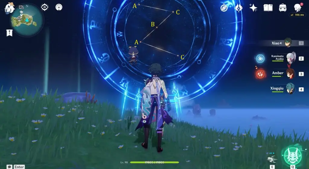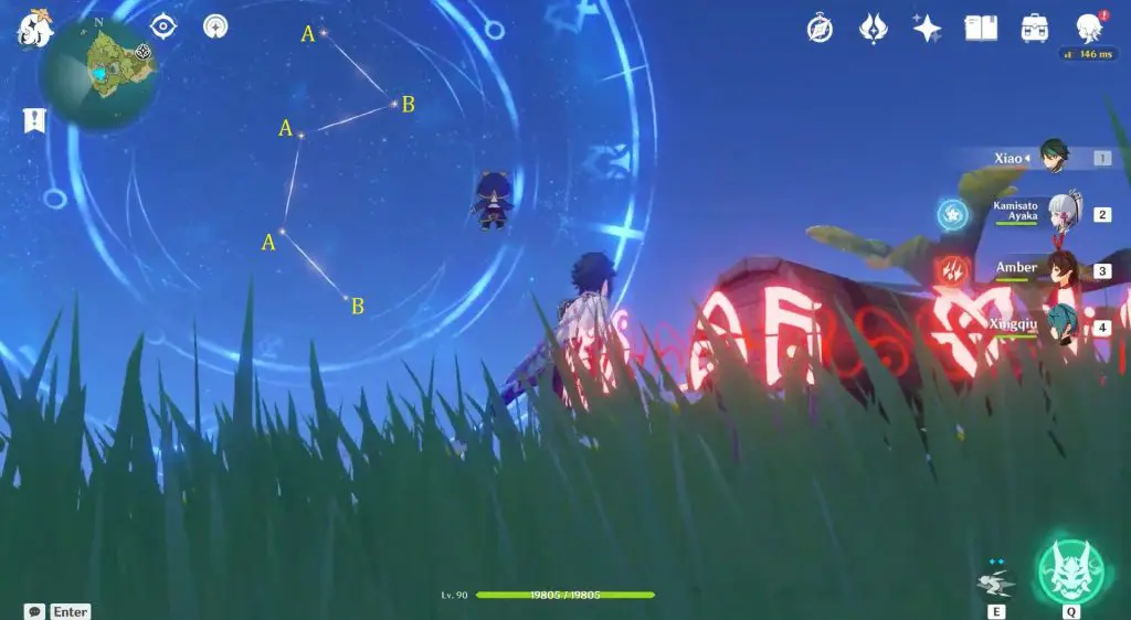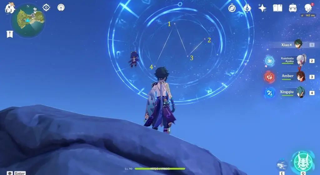 The location of the puzzle is shown in the picture below. To solve the puzzle, link the star guides as shown in the second picture below. On solving the puzzle, a Precious chest will spawn. Open the chest and a Starlight will come out from it. Chase the starlight to its destination and then capture it. This starlight will lead you to a constellation puzzle that will give you three Luxurious Chests.