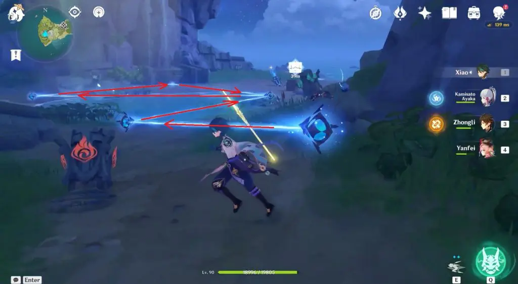 After solving the previous puzzle, the stars on the wall will form an arrow. Touch the wall the arrow is pointing to, to open it. Proceed ahead and take the astral path up to a room with four circular switches on the floor. In the same room, you will see four circular switches on the floor. You will see a pattern drawn on the floor near the switches. To solve the puzzle, you need to step on the switches to form the same pattern in the sky. This can be done in 8 steps as shown in the picture below. I have named the switches A, B, C, and D for ease of explanation. On solving the puzzle, the precious chest in this room will unlock.
