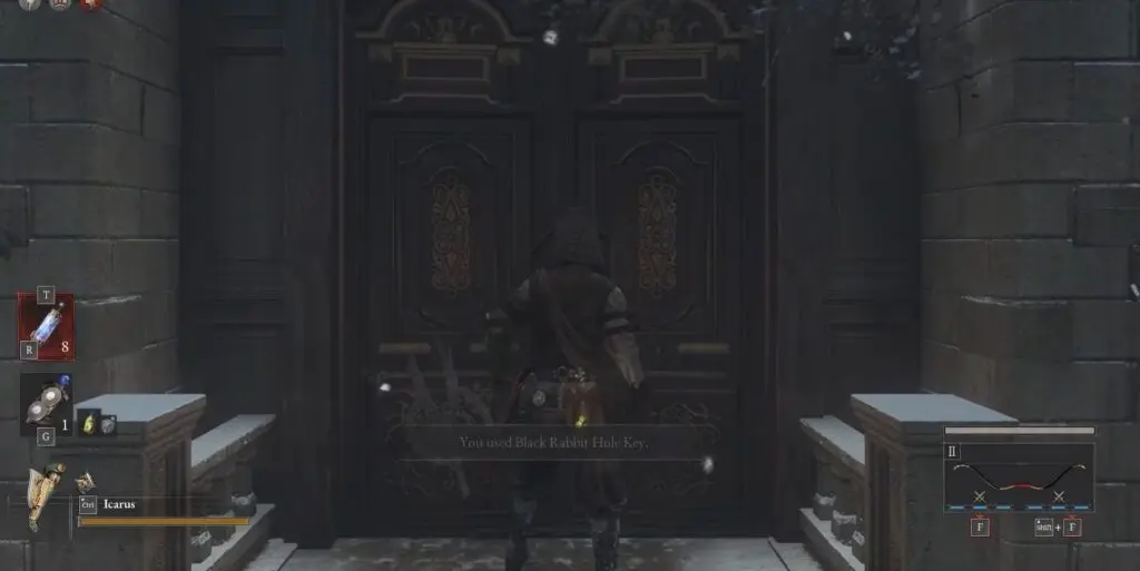 From there, follow the right-hand path once more to find a locked door. Use the Black Rabbit Hole Key to unlock it and enter the hideout.
