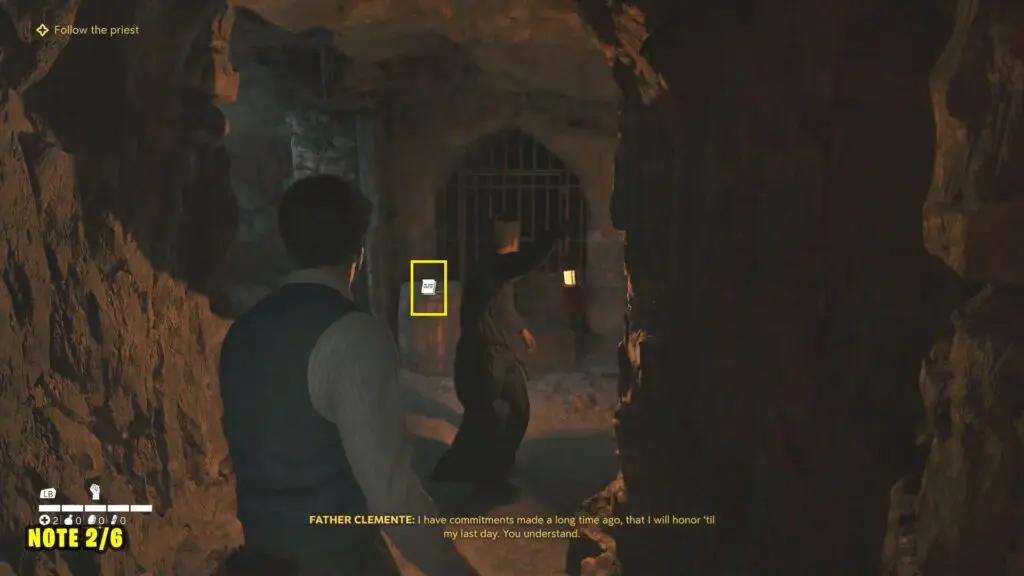 Follow the priest to reach the basement. He will instruct you to move the boxes to clear the path. Once the path is clear, you’ll find the note on a wooden barrel inside.
