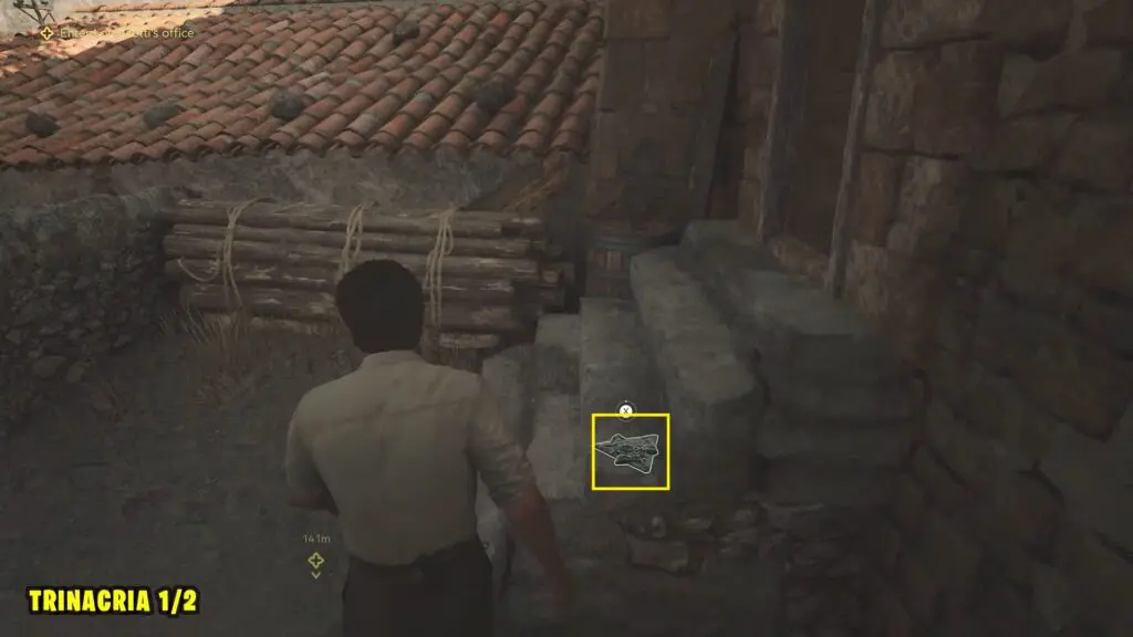 Follow the main story to advance to the objective: “Enter Lorenzetti’s Office.” Trinacria 1/2 is located on the stairs of a building in the southeastern corner of the area. Please refer to the map for guidance.